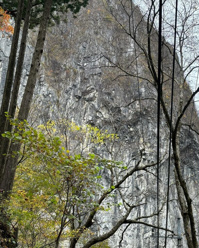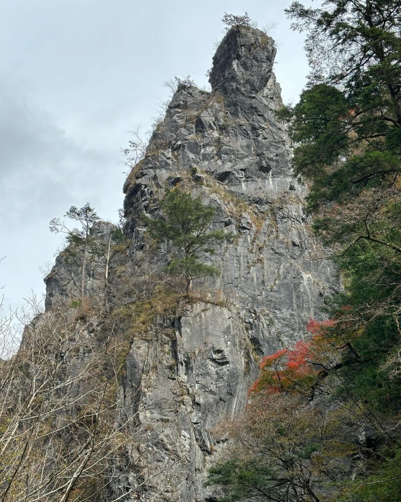 洞窟の近くには、自然の造形美として知られる梵天岩があります。 高さ約90メートルの細長い岩は圧巻で、石灰の多い日原の地質が生み出した奇跡の造形。 「自然が彫刻した作品」と言われるのも納得の迫力です。