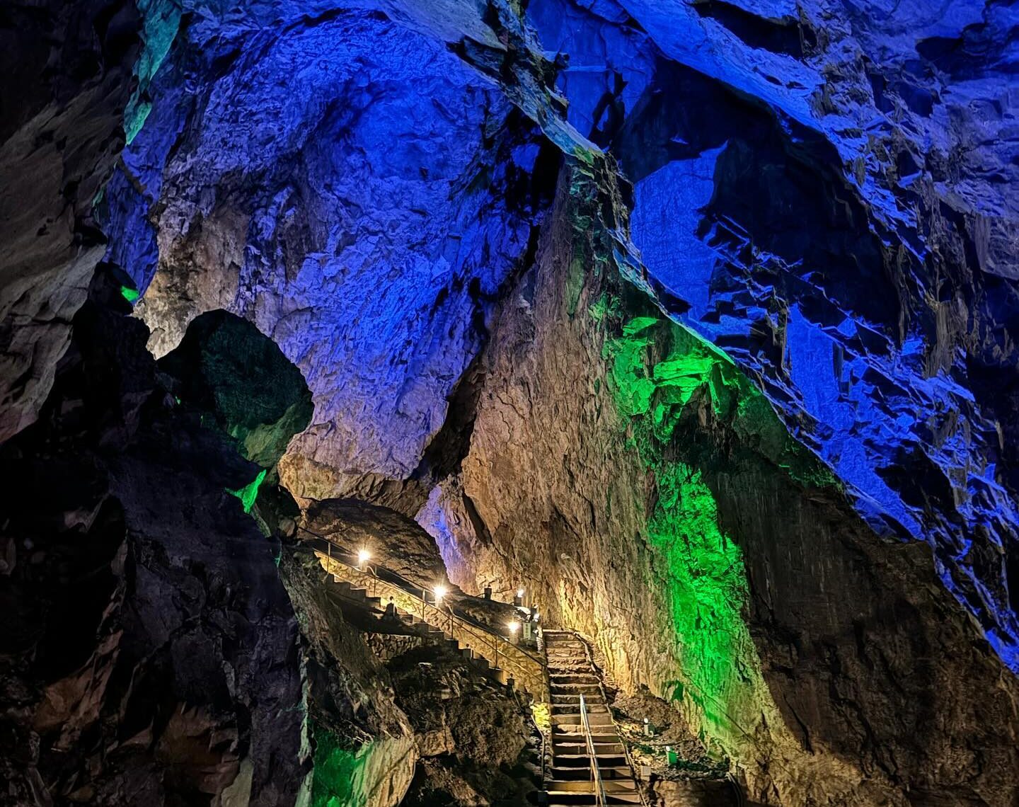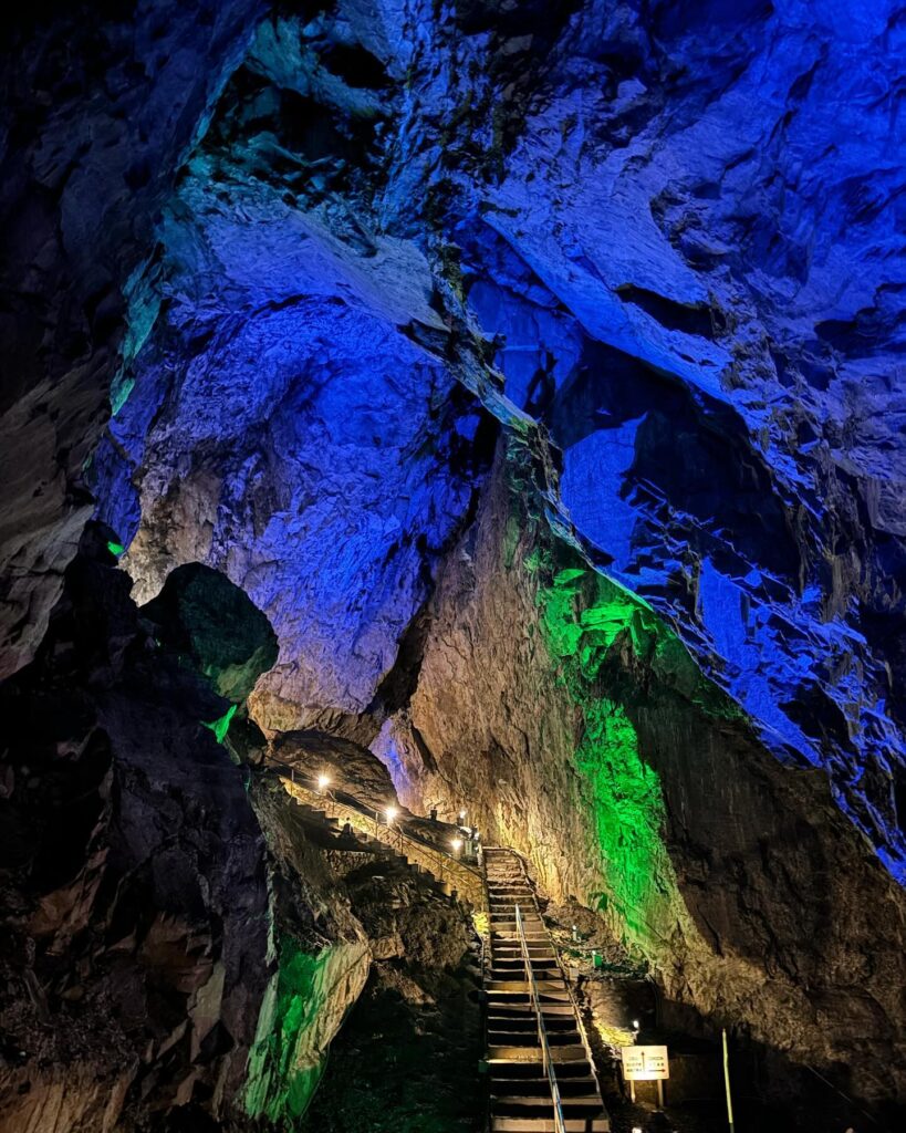 鍾乳洞内の気温は年間を通じて約11℃。 夏はひんやりと涼しく、冬は少し暖かく感じる不思議な空間です。 ライトアップされた内部は思っていた以上に華やかで、まるで別世界に迷い込んだよう。 私の中では“鍾乳洞=白い岩”というイメージでしたが、ここは意外にも黒っぽく、光に照らされると青や金に輝く箇所もありました。