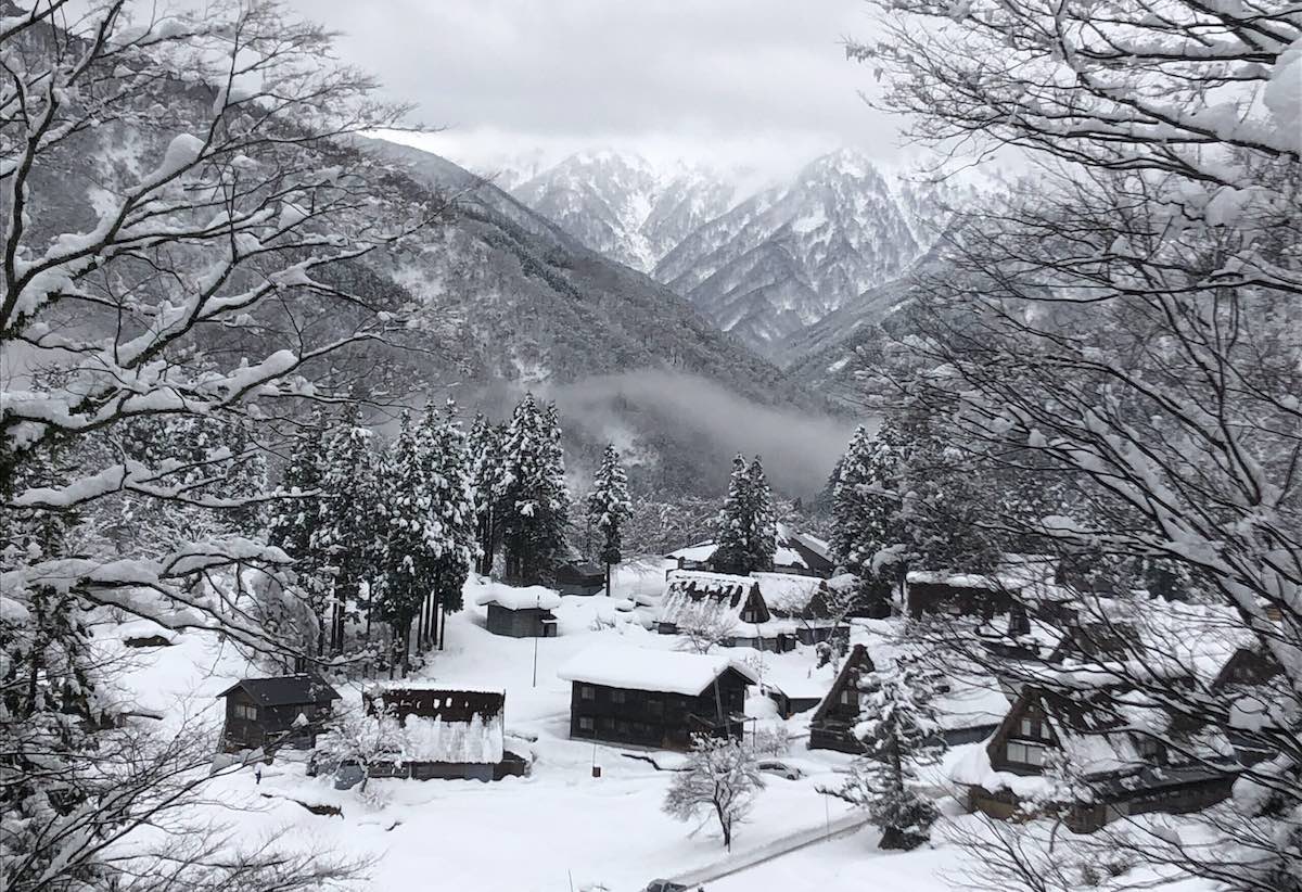 雪に覆われた茅葺き屋根と煙の上がる家々が並び、カラー写真なのにまるで水墨画のよう。