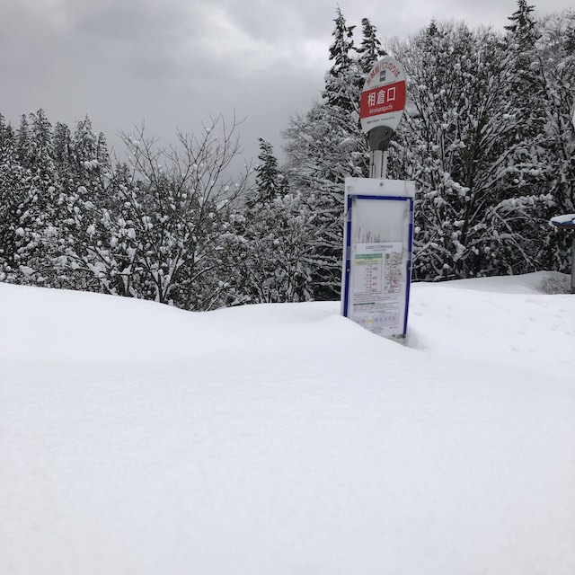 相倉口バス停に着くと、時刻表の下まで雪が積もっていましたが、道路はきちんと除雪されており、歩くことは問題ありませんでした。