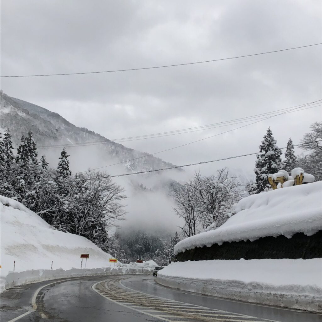 金沢駅西口から南砺金沢線のローカルバスに乗って城端駅へ。そこから白川郷行きの世界遺産バスに乗り換え、最初の目的地「相倉口バス停」で下車しました。車窓から見える景色は次第に雪深くなり、ひとり旅の心細さを感じるほど。相倉口バス停に着くと、時刻表の下まで雪が積もっていましたが、道路はきちんと除雪されており、歩くことは問題ありません。