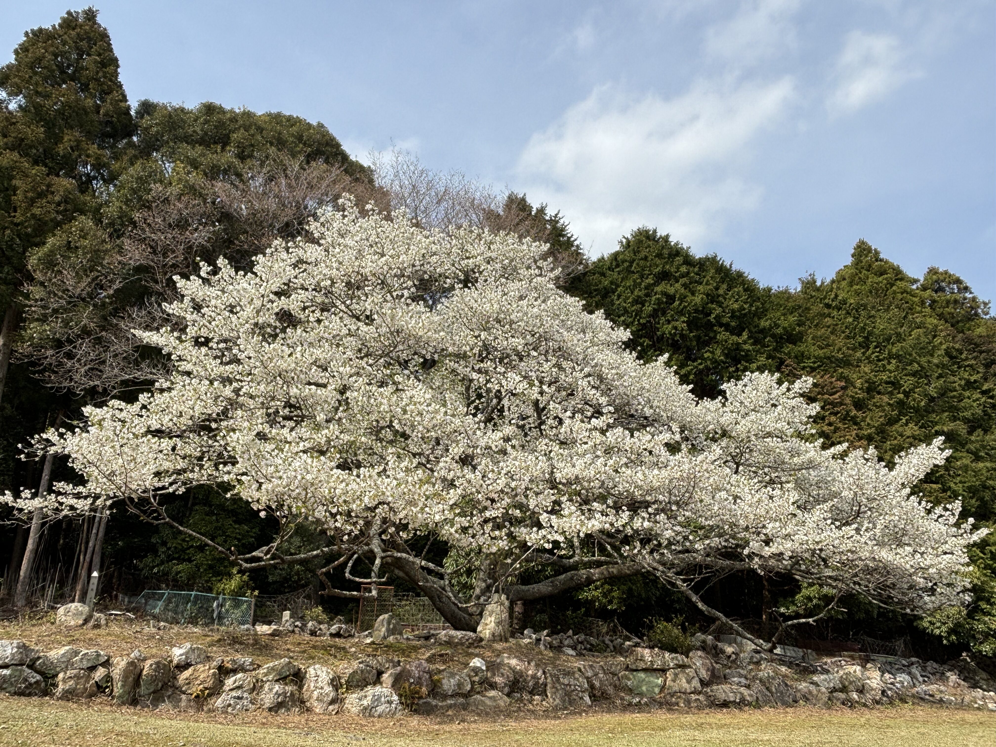 天の岩戸の参道を進むと、目に飛び込んできたのは見事な大島桜。前回季節が違って気づかなかったこの桜は、高さ約13メートル、幹回り約3メートル、枝の幅は約20メートルにもなる大木です。ちょうどお祭りが開かれていて、地域の方たちの温かい雰囲気に包まれながら花見を楽しみました。