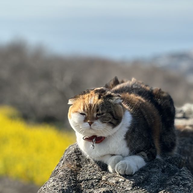 菜の花の小径と、人気者の猫「チャミ」ちゃん