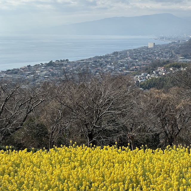 相模湾の青、菜の花の黄色、そして冠雪の富士山──。