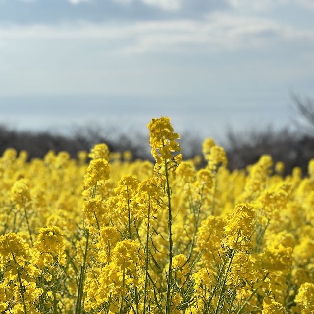 菜の花畑の中には降りられる小径もあり、満開の黄色に包まれながら歩く時間は、まるで春の夢の中のよう。