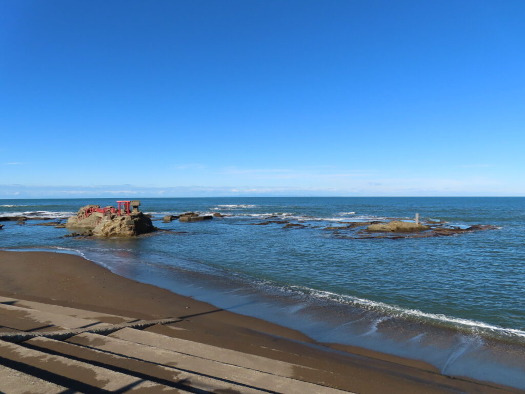 高台から見えた、海岸から少し離れた場所に佇む番神神社。潮が引けば歩いて渡れるそうですが、この日は潮位と季節の関係で断念。こちらもまた、次回のお楽しみとなりました。