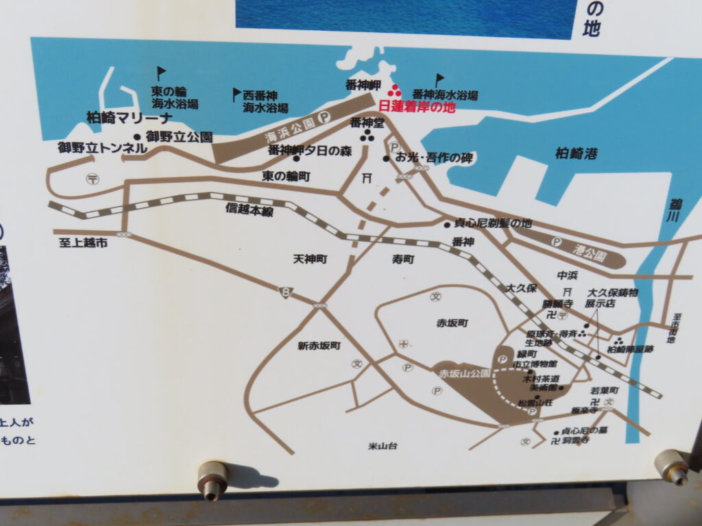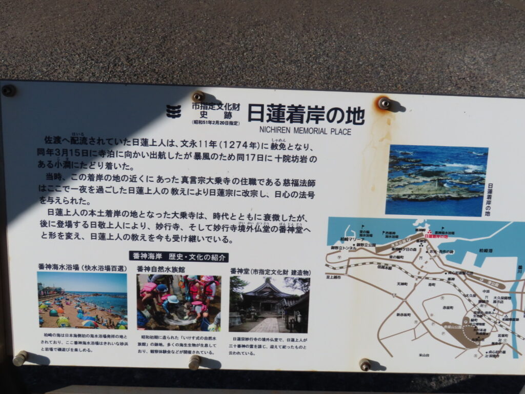 説明書きによると、佐渡流罪を赦免された日蓮聖人が寺泊へ向かう途中、大風により漂着したのが番神岬。このときの着岸地点の目印とされる塔が、今も海上に残されています。