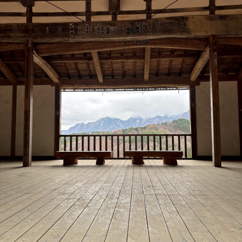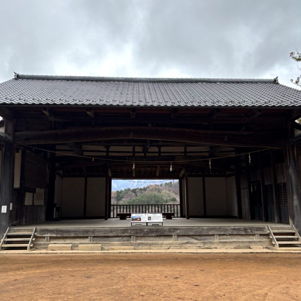 別所神社の神楽殿からの景色は、まるで額縁に入った名画のよう。晴れて青空でなくても、しばらく立ち止まって眺めていたくなる光景でした。