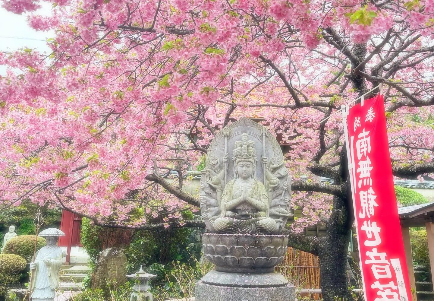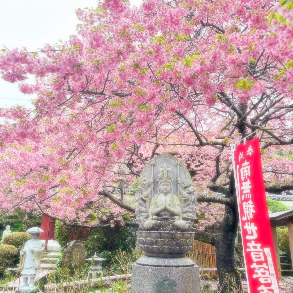 「てんれい桜」は、大慈寺の先代和尚が伊豆を訪れた際、河津桜の美しさに感動して分けてもらった数本から育てられた桜だそうです。いまでは境内いっぱいに広がり、静かに春を彩っています。