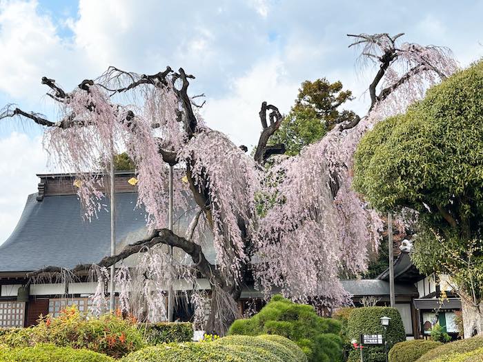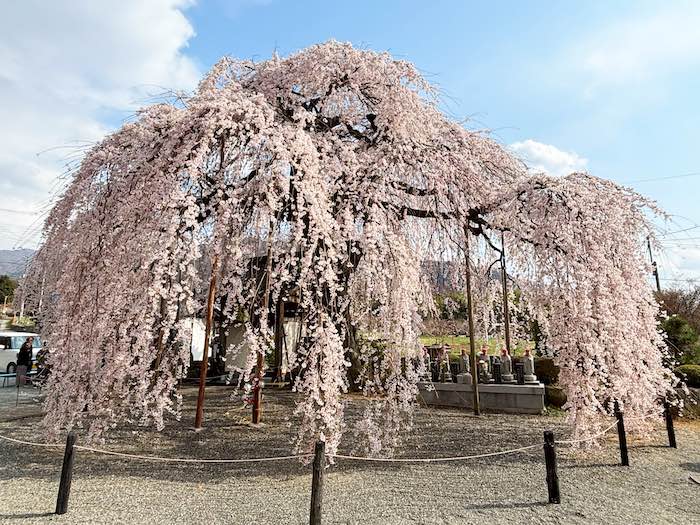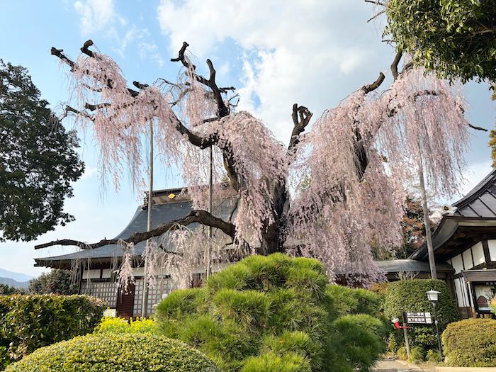 境内に入ると、大きく枝を広げたイトザクラが目に入ります。