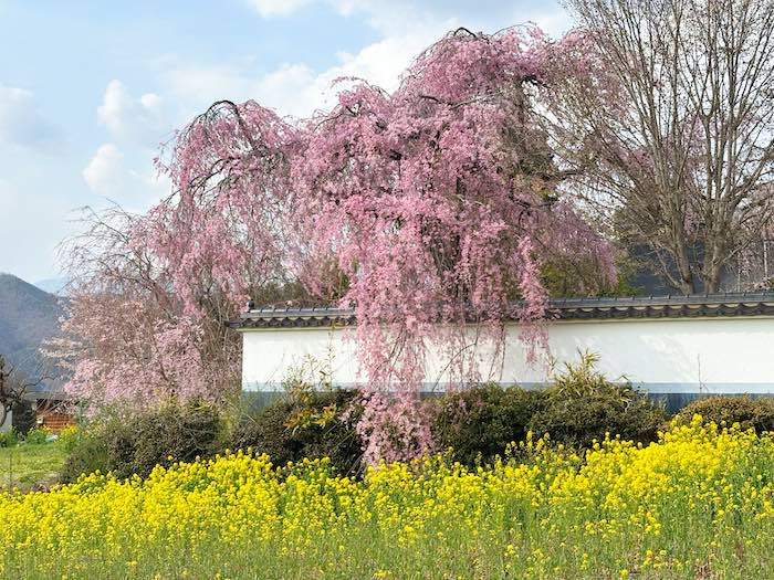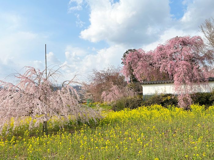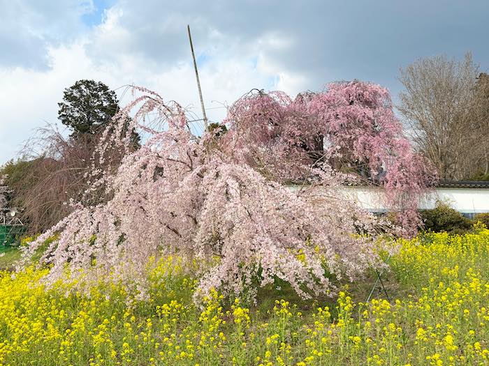 南側の門付近では、菜の花と桜が並ぶ春らしい景色も楽しめます。