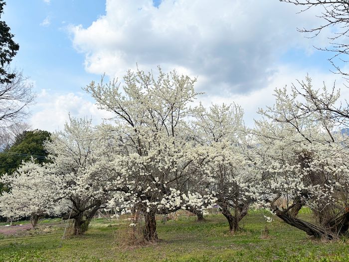 徒歩で7〜8分ほど。途中には桃の花が咲き、山には淡いピンクの桜も見え、春の景色の中を歩いていきます。