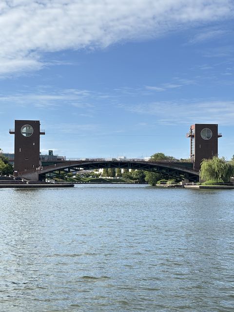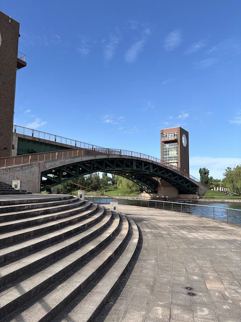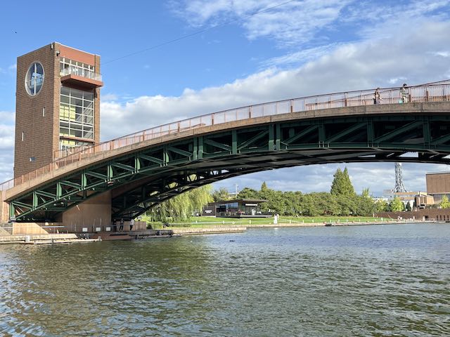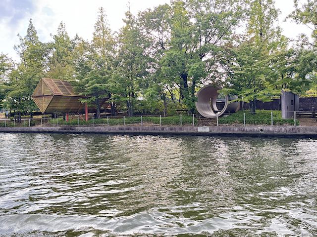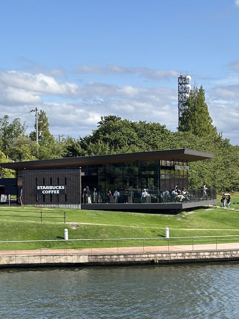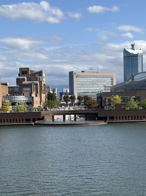 運河沿いにはアステラス製薬のモダンな建物もあって、水辺の景色にすごくマッチしています。