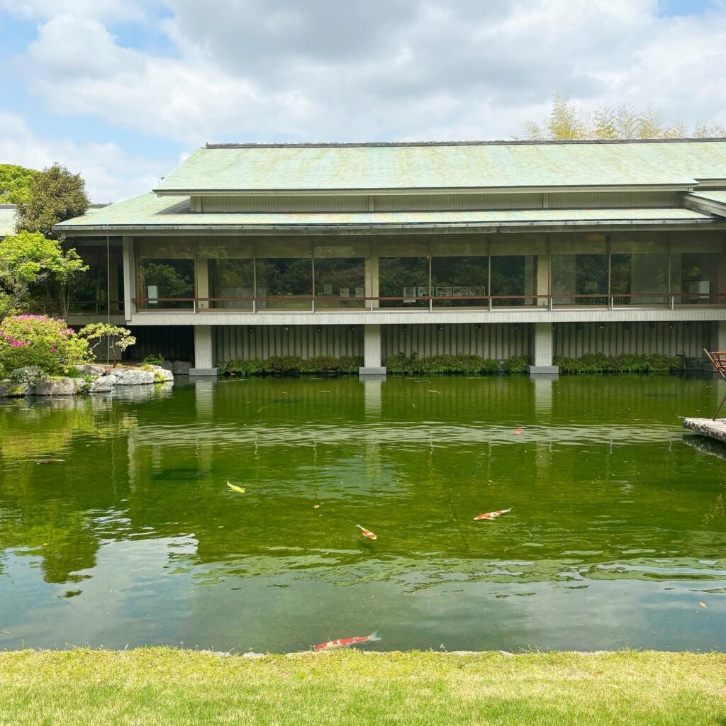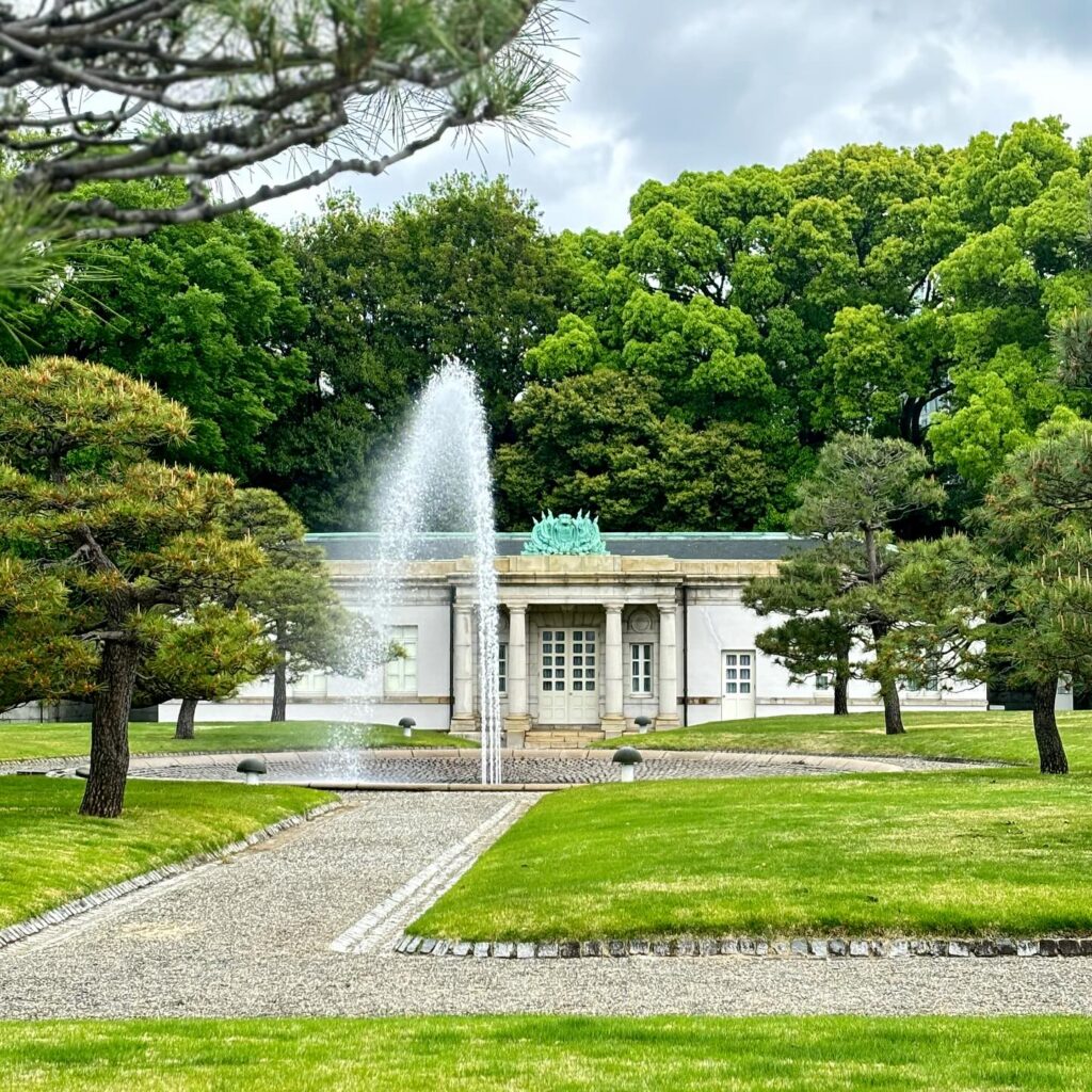 本館はフランスから輸入された1トン以上のシャンデリア、西陣織の綴錦織、七宝焼など和の要素も取り入れられた豪華な内装。天井画も美しく、ニュースで見たあの部屋が目の前にあることにテンションが上がります。主庭にある噴水は、噴水として初めて国宝に指定されたとのことです。