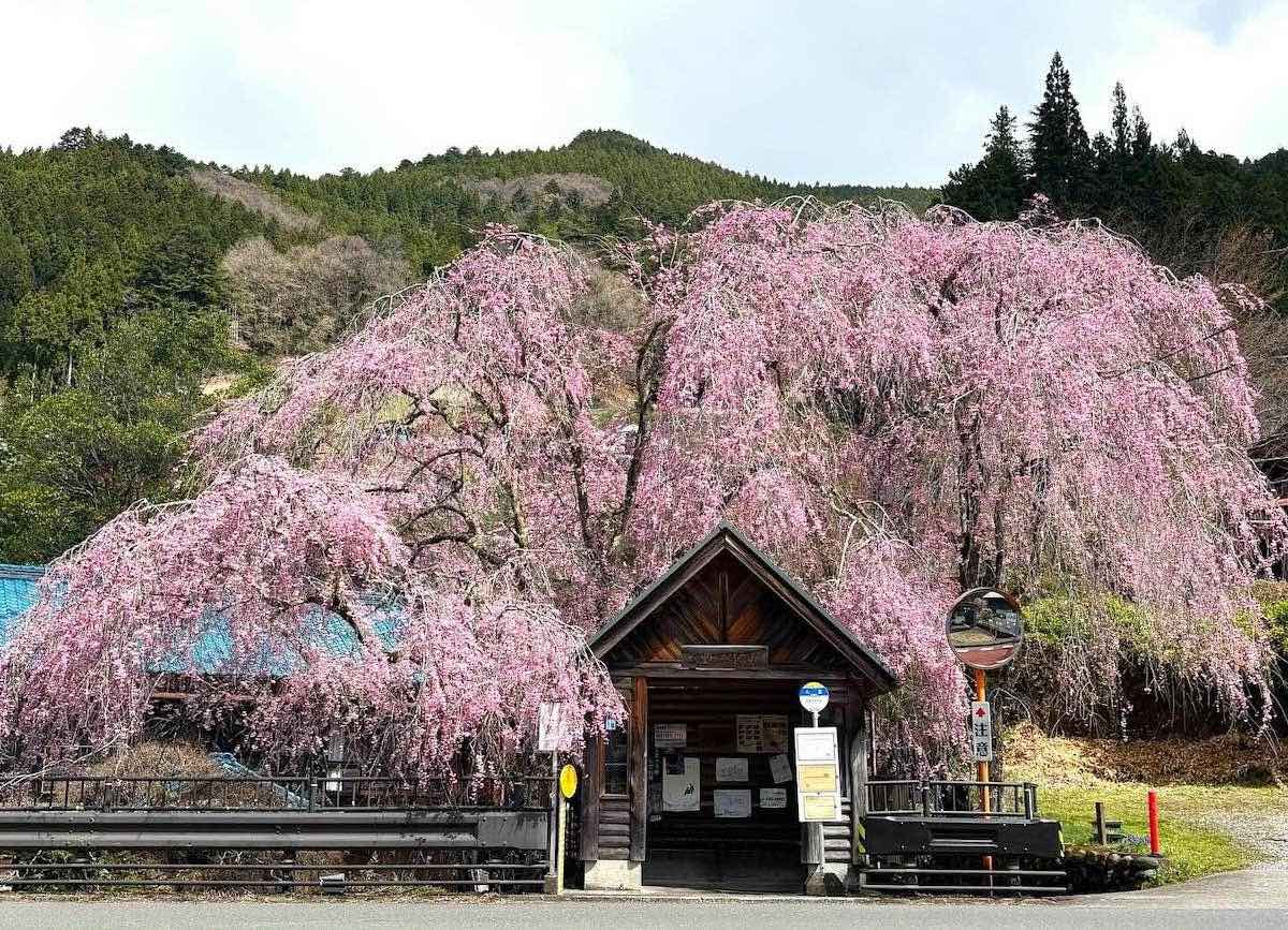 武蔵五日市駅からは西東京バスの数馬行きに乗車し、約50分で「人里(へんぼり)」バス停に到着します。枝垂れ桜はバス停のすぐ後ろにあり、下車すると待合所の屋根に覆いかぶさるように咲く桜を見ることができます。