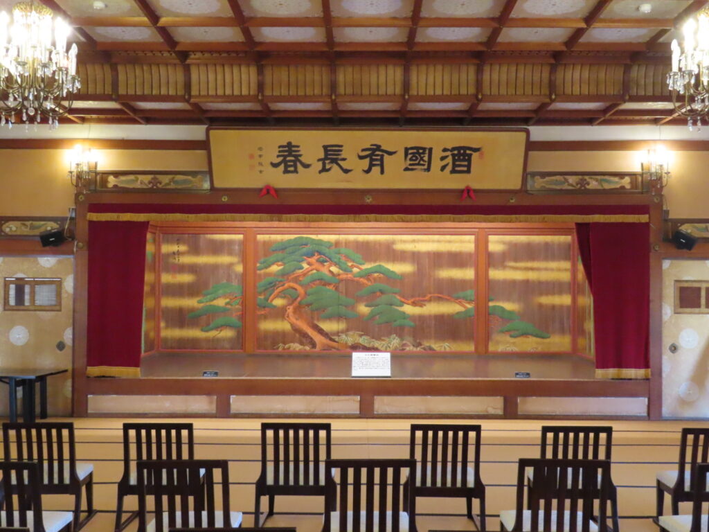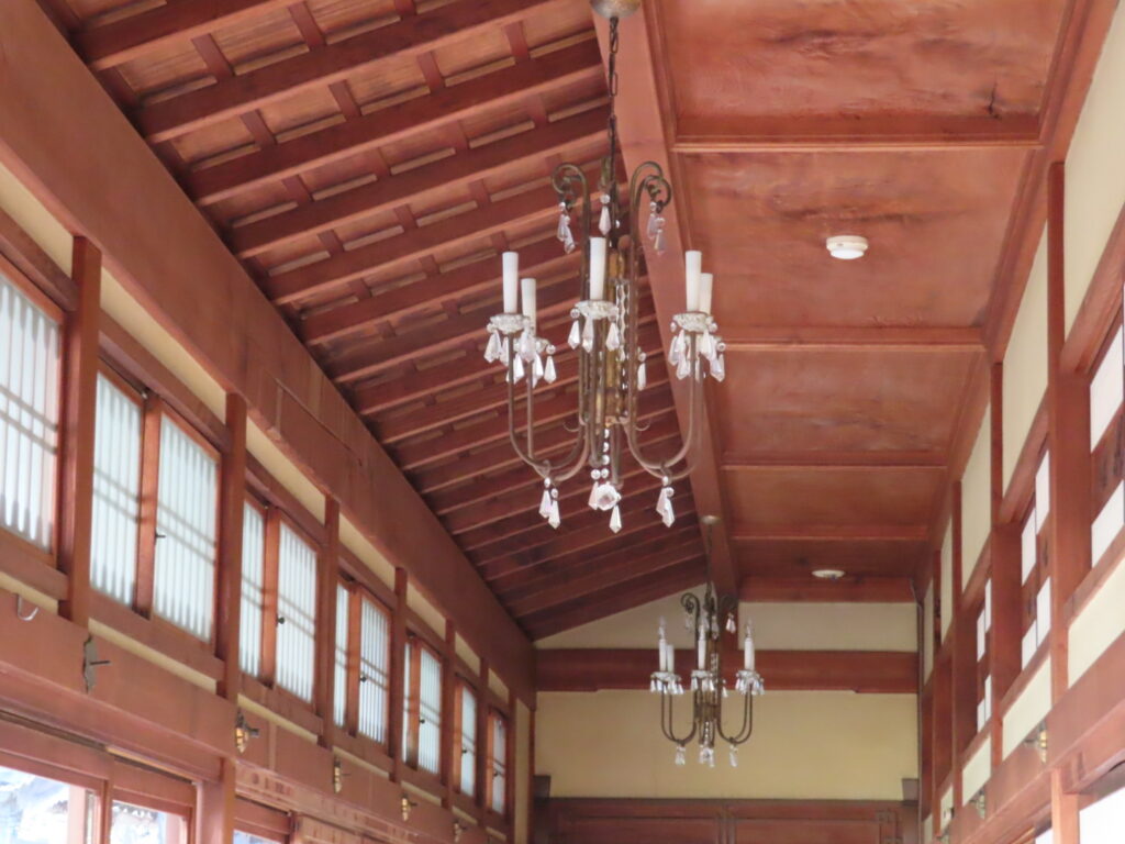 特に印象的だったのが、2階にある桃山式折上格天井の120畳の大広間。 畳敷きの空間にシャンデリアが溶け込み、明治期らしい和洋折衷の豪華さが感じられました。