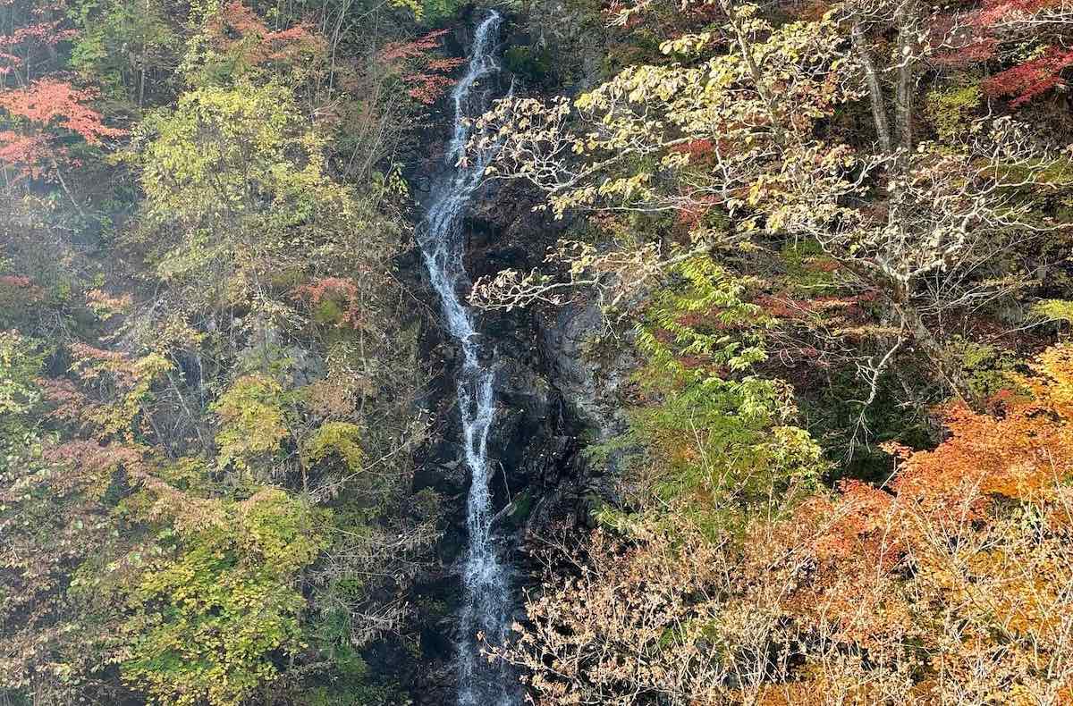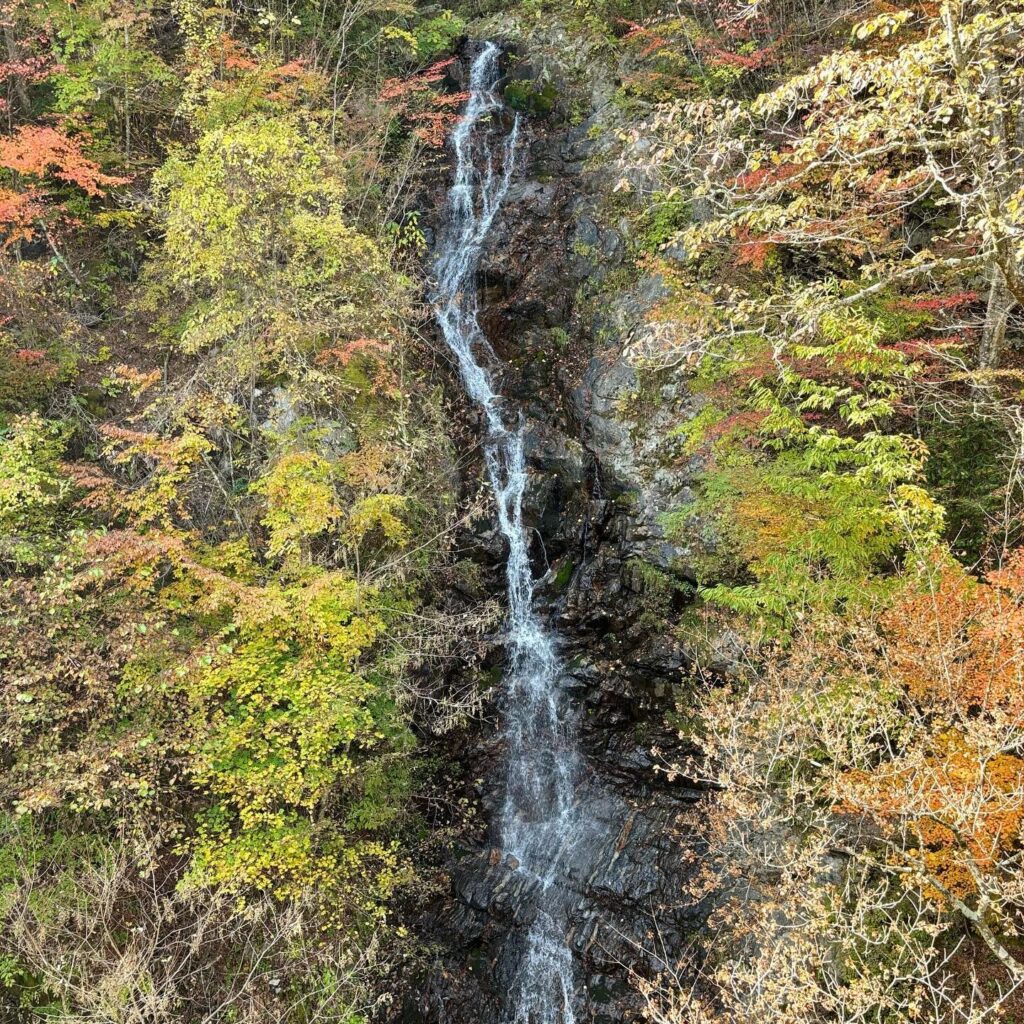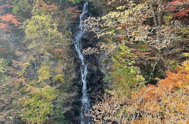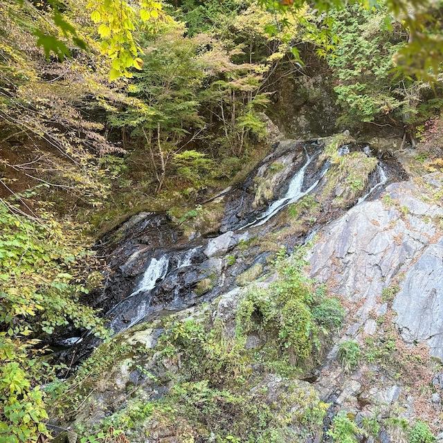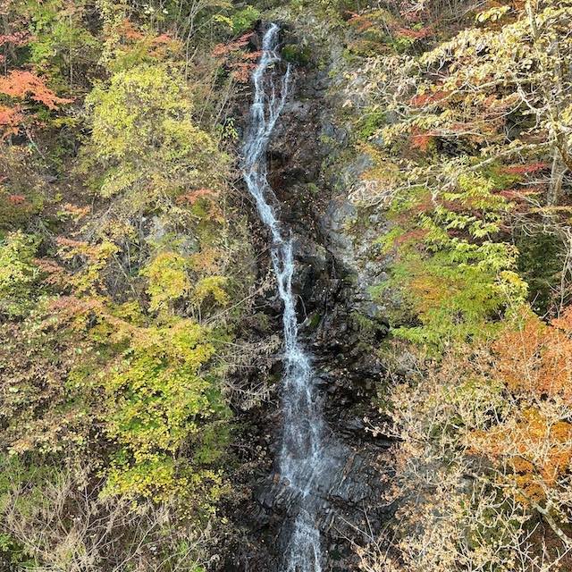 夢の滝は落差約19メートル。今回のコースの中で唯一、周遊道路から眺められる滝です。 その名の通り、まるで夢の中に現れるような穏やかな姿。山々に囲まれ、 白い水の筋が光にきらめく姿は、秋の檜原村らしい静かな美しさを感じさせます。