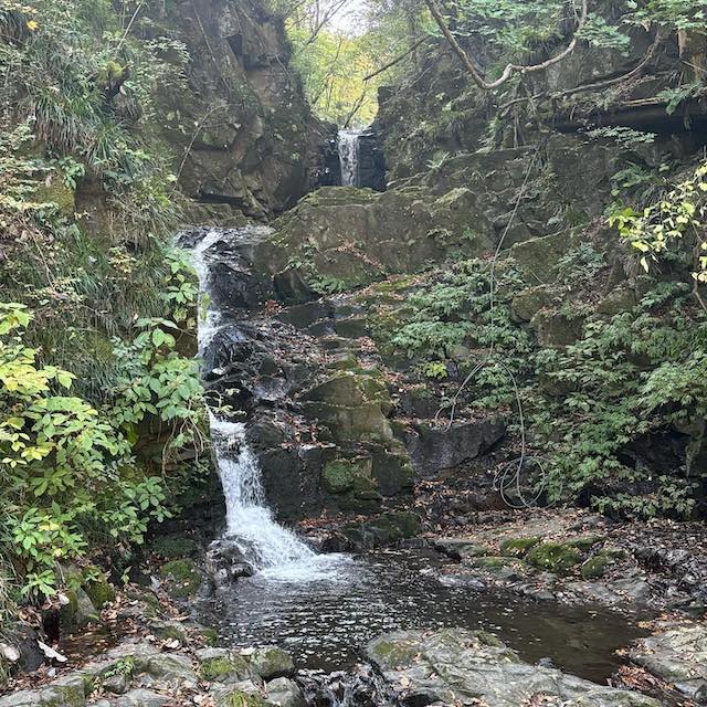 次に訪れたのは菅平(すがだいら)の滝。落差約10メートル、2段の滝です。 訪れる人が少ない場所のようで、やや道が荒れた印象でしたが、このイベントのために スタッフの方々が倒木や枝を丁寧に取り除いてくださっていました。 階段を下ると滝のすぐそばまで行ける距離感。深い淵をもつ二段の滑滝で、 さらに上流には3段ほどの小滝群もあるそうです。