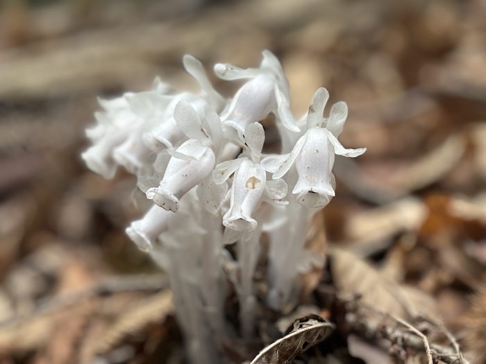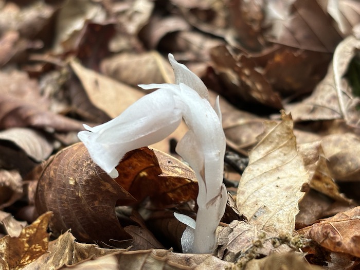 ふと足元に目をやると、落ち葉の間から白く透き通るような姿が現れます。思いがけず出会ったギンリョウソウは、森の中でひっそりと光を放つようで、思わず足を止めて見入ってしまいました。木漏れ日の中に浮かび上がるようなその姿が、とても印象に残っています。
