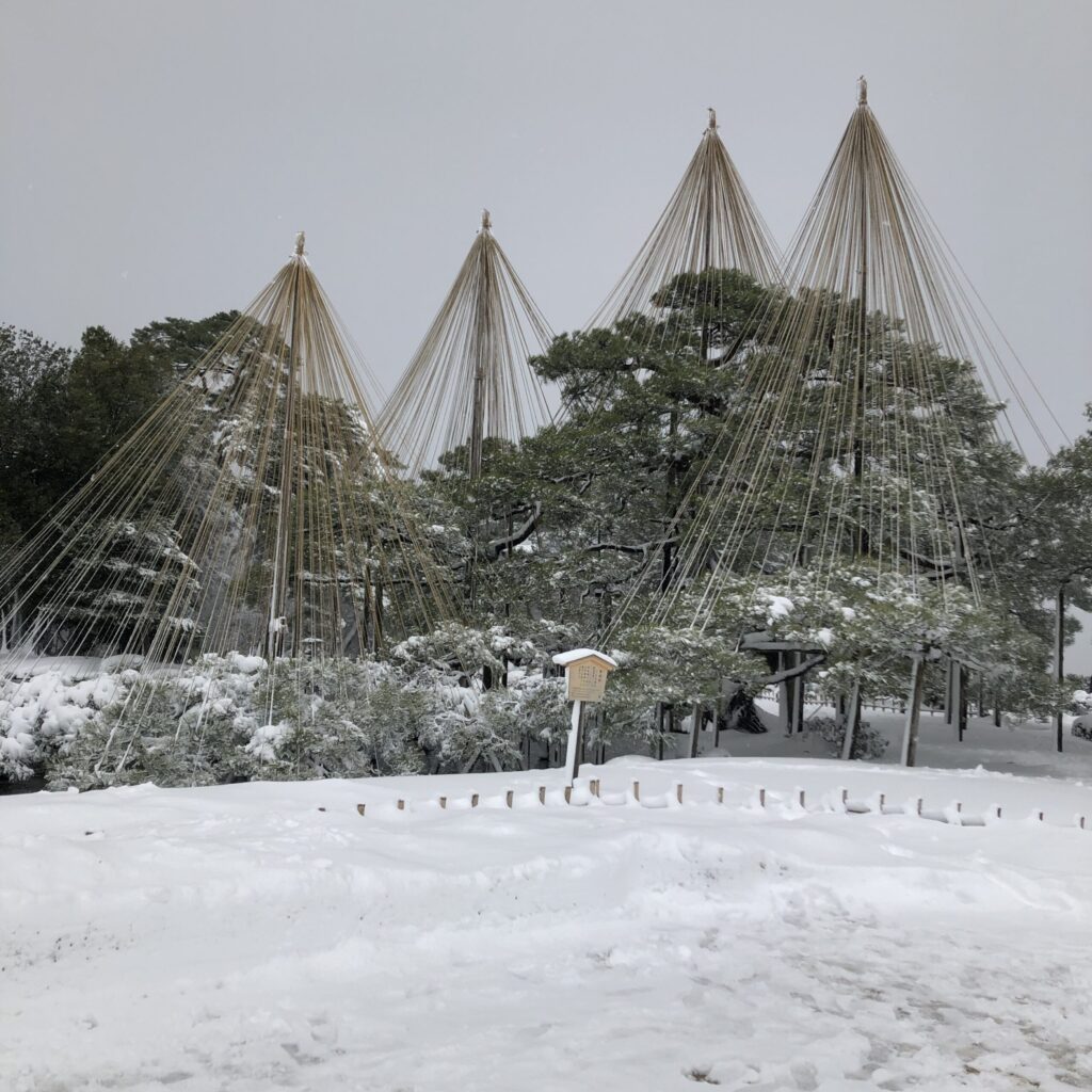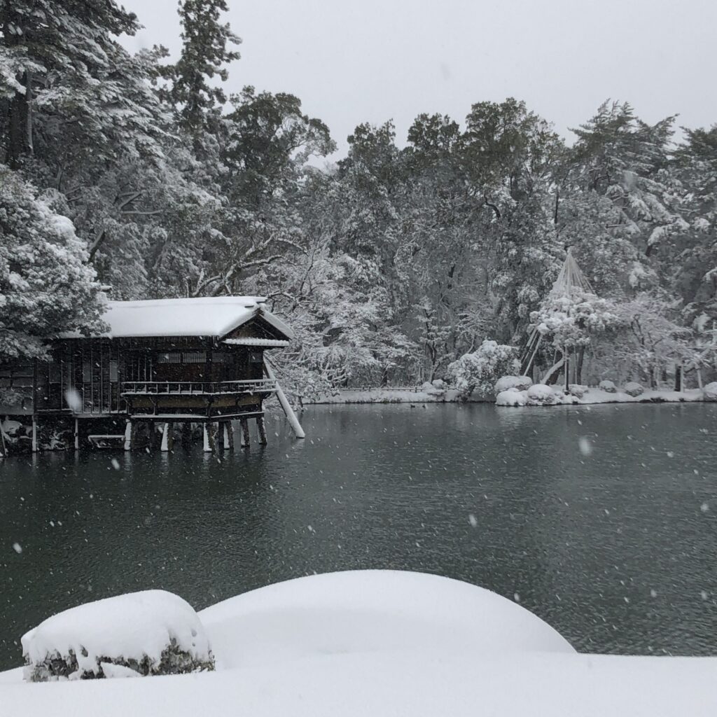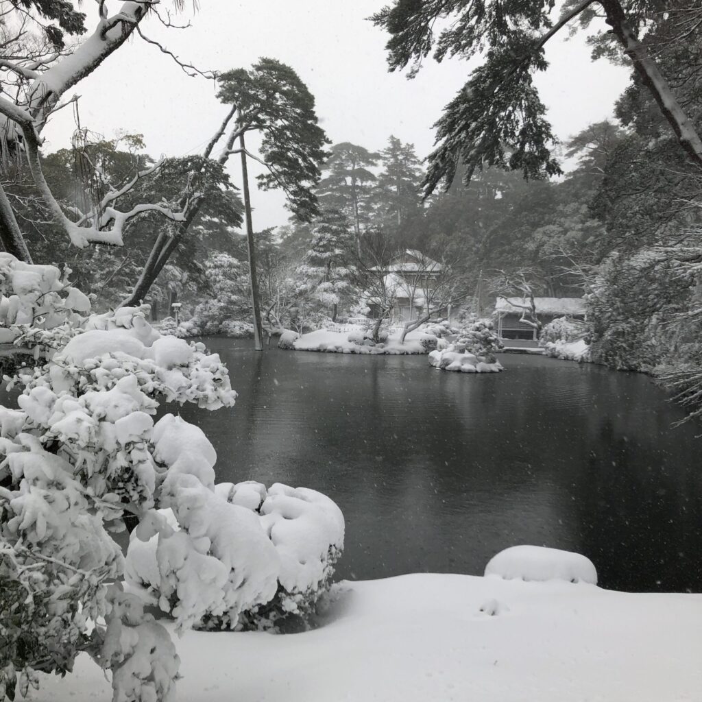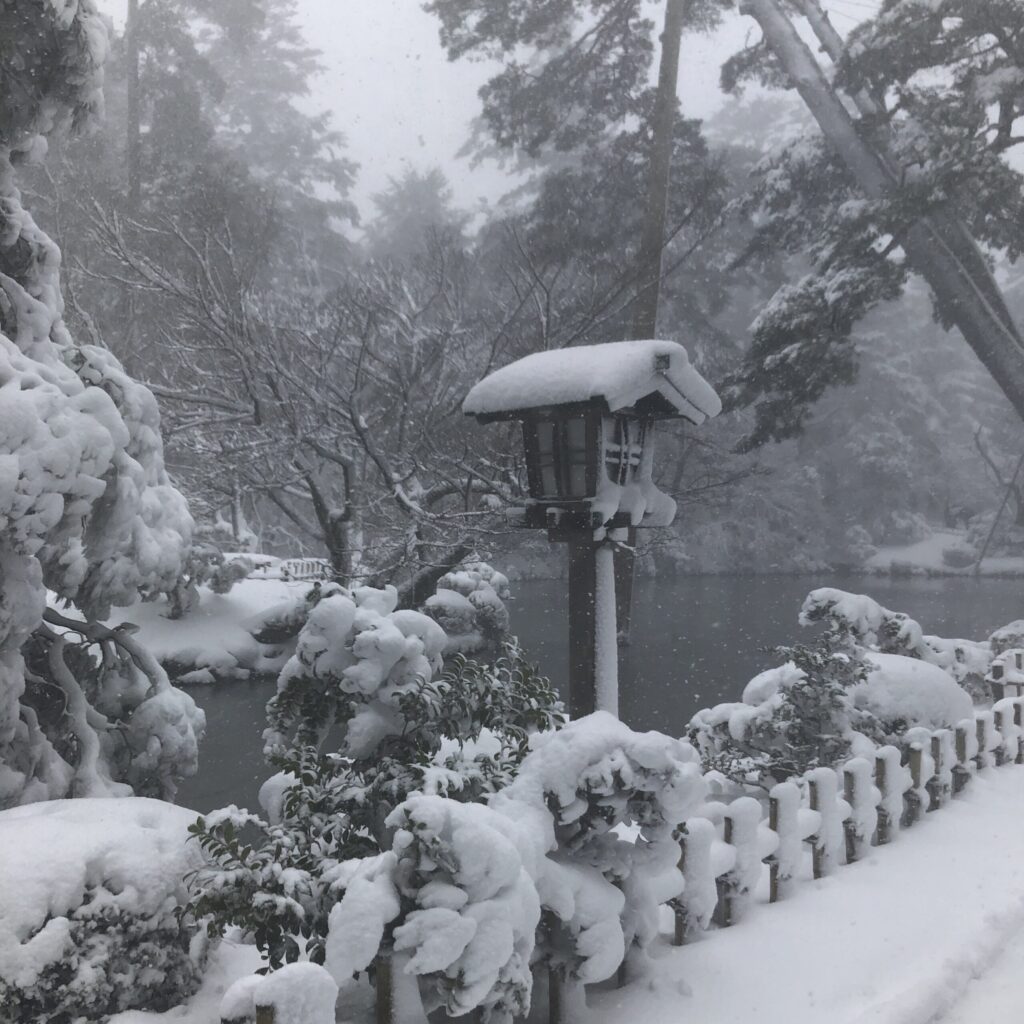兼六園に着くと、雪はしんしんと降り続き、石川門の屋根や石垣も白く染まっていました。まだ除雪が追いつかず、人が通ってできた細い道を踏みしめながら歩きます。足の裏に伝わる雪の感触が懐かしく、まるで時間が巻き戻ったようでした。