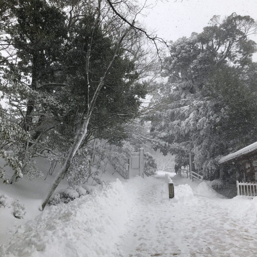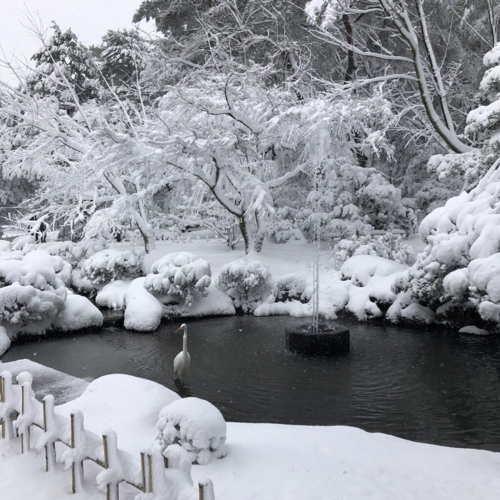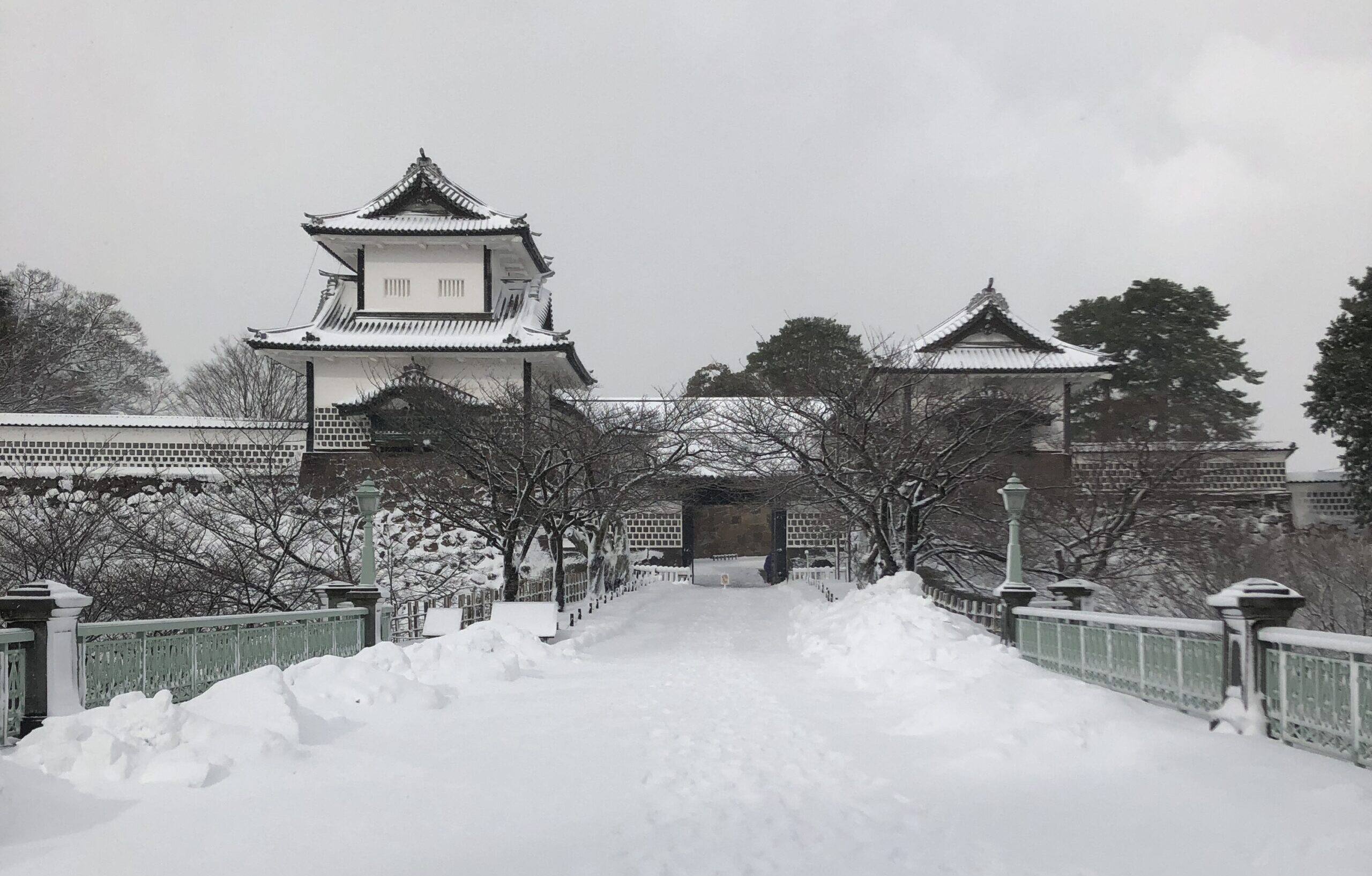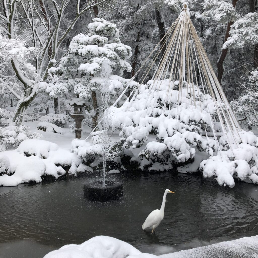 兼六園に着くと、雪はしんしんと降り続き、石川門の屋根や石垣も白く染まっていました。まだ除雪が追いつかず、人が通ってできた細い道を踏みしめながら歩きます。足の裏に伝わる雪の感触が懐かしく、まるで時間が巻き戻ったようでした。