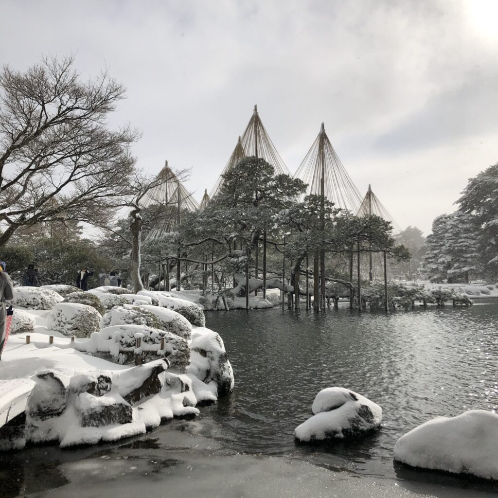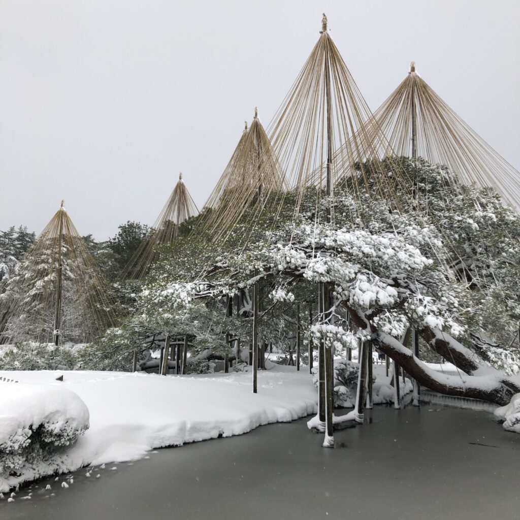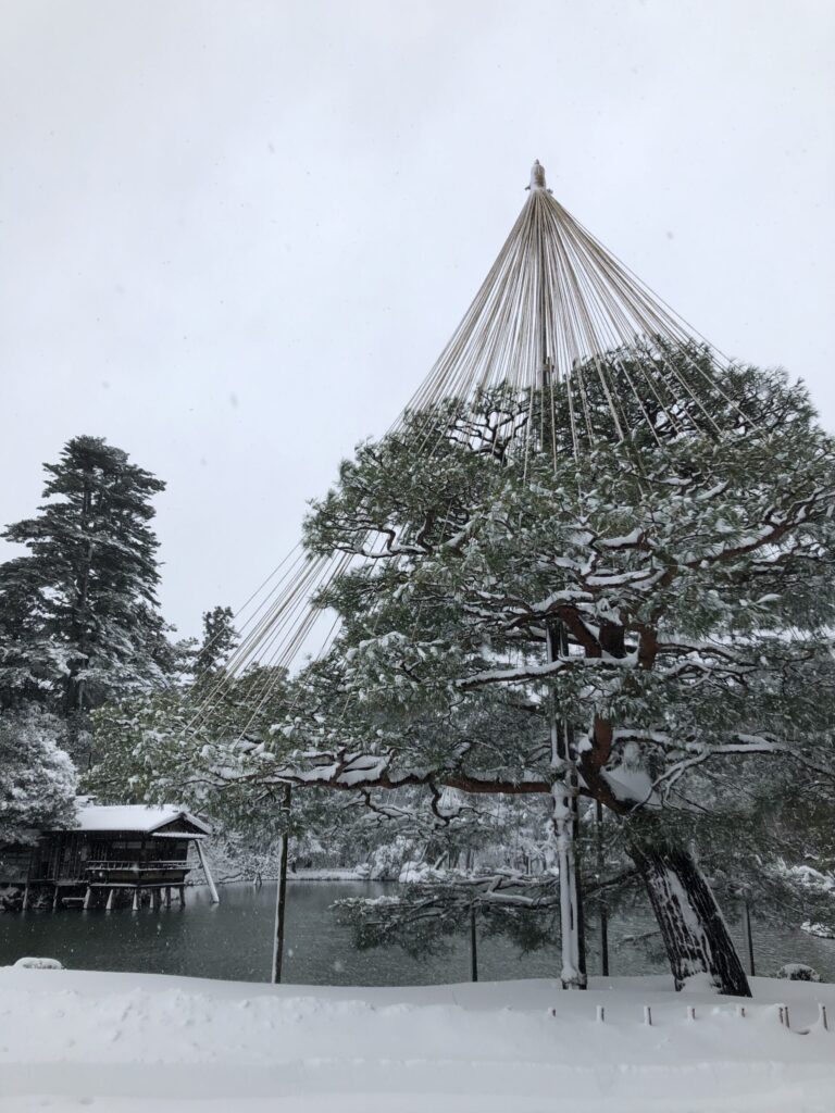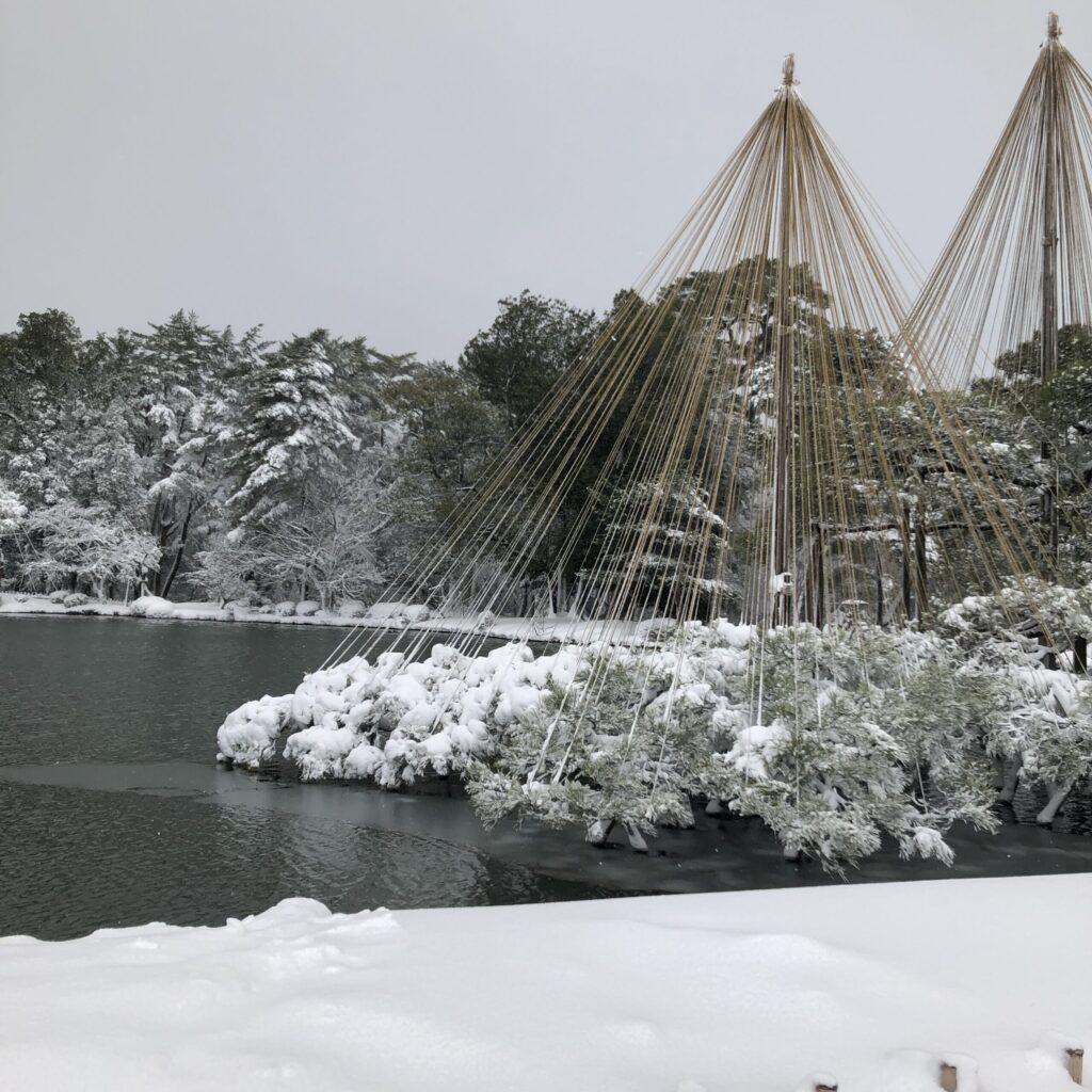 兼六園の池は部分的に凍っているようにも見え、雪をまとった木々や灯籠が水面に映る景色は、まるで水墨画のよう。写真はもちろんカラーですが、モノクロームのような静けさをたたえた世界がそこにありました。これこそが北陸の冬らしさ。凛とした空気の中に、どこか優しさと懐かしさを感じます。