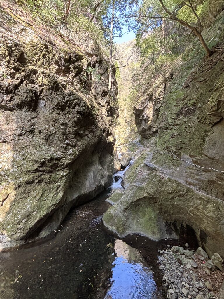 北秋川支流の神戸川上流に位置するこの場所は、高さ約100m・幅約140mもの絶壁がそびえ立つ、まさに東京都が誇る秘境スポットです。