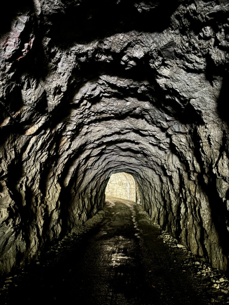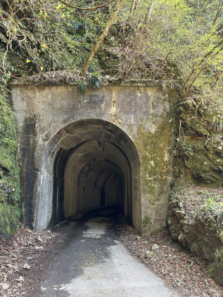 神戸岩は一方通行になっていて、帰りは手掘りされた真っ暗な隧道を通ります。ライトで足元を照らしながら進むその道もまた、ちょっとした冒険気分を味わえるポイント。