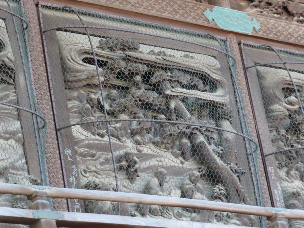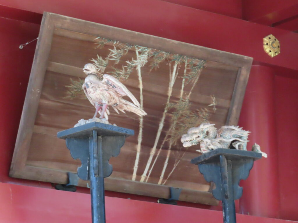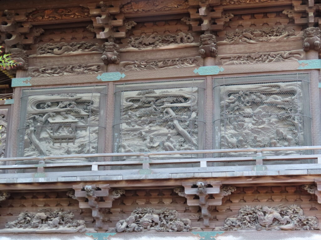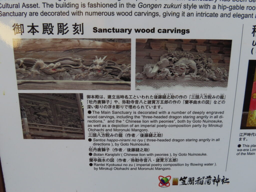 境内には奉納された絵馬や額が数多く並ぶ絵馬殿があり、休憩できるスペースにもなっています。大きな楼門、1960年竣工の拝殿、そして狐が並ぶ狐塚。特に、拝殿は総けやき造りで、周囲は当時の名工たちの技による「蘭亭曲水の図」や「三頭八方睨の龍」など精緻な彫刻で飾られていてどこを切り取っても歴史の深さを感じる空間です。
