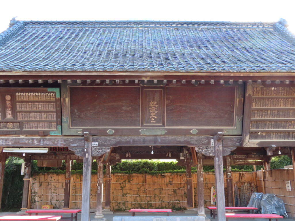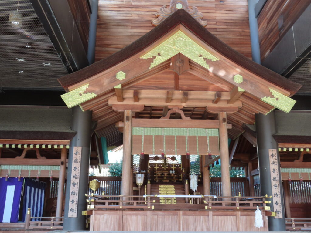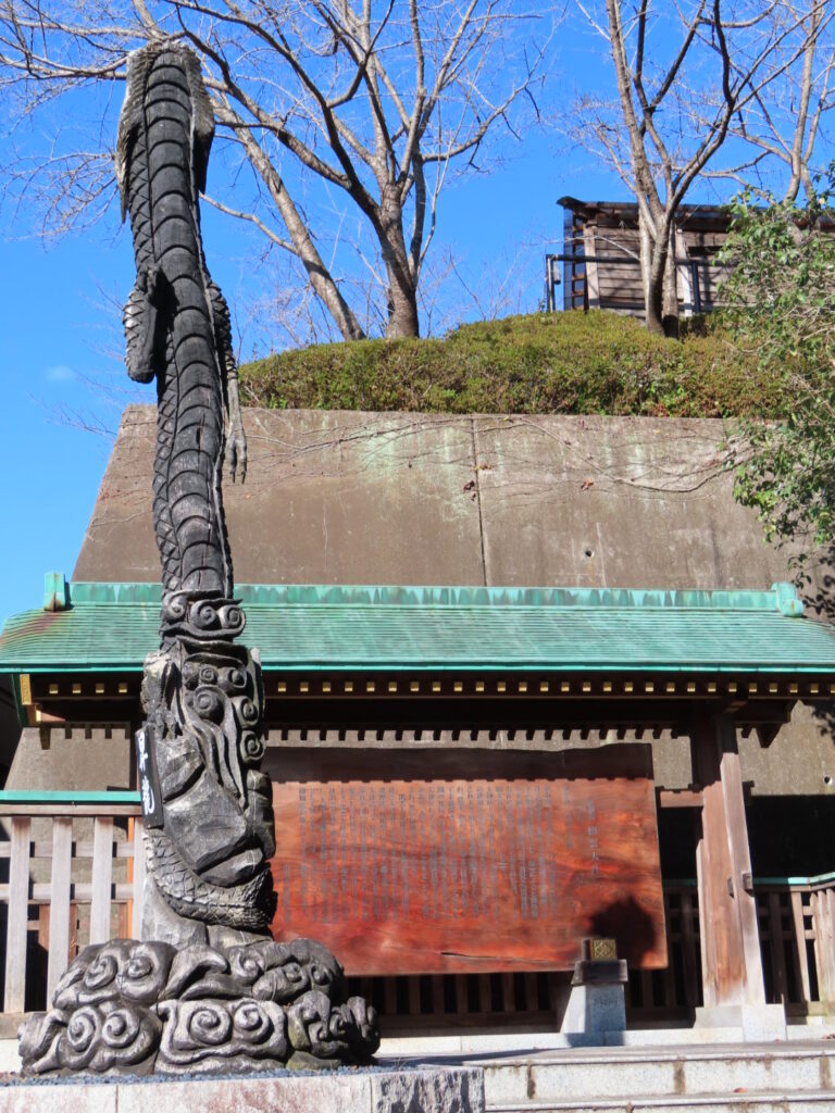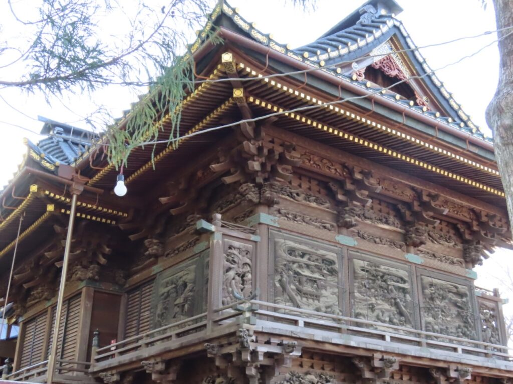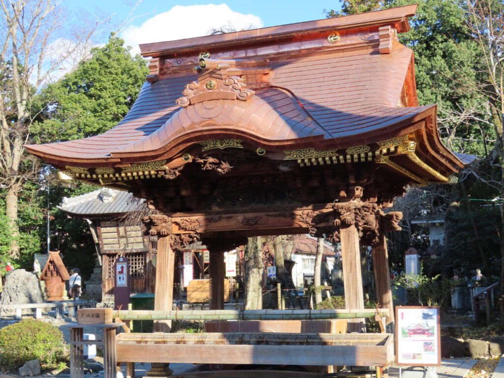 境内には奉納された絵馬や額が数多く並ぶ絵馬殿があり、休憩できるスペースにもなっています。大きな楼門、1960年竣工の拝殿、そして狐が並ぶ狐塚。特に、拝殿は総けやき造りで、周囲は当時の名工たちの技による「蘭亭曲水の図」や「三頭八方睨の龍」など精緻な彫刻で飾られていてどこを切り取っても歴史の深さを感じる空間です。