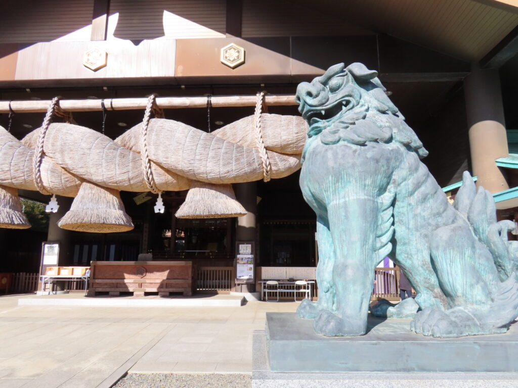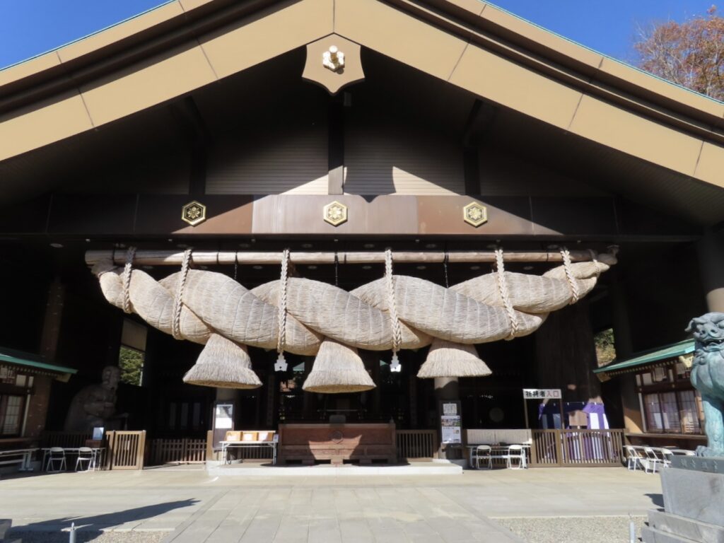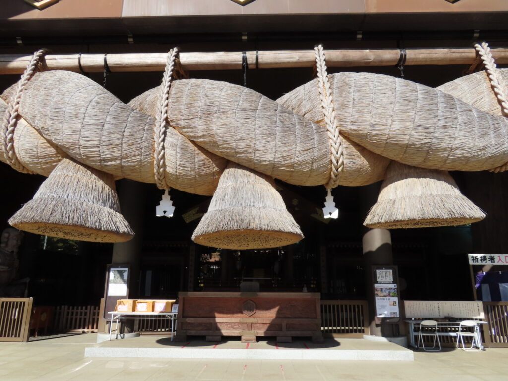 入り口から坂を上がり、階段を登ると「おおお〜!」と思わず声が出そうな景観が目に広がります。大社造りのご本殿、そして長さ16m・重さ6tの巨大注連縄がかかる拝殿。初めて目にするその迫力に息を呑みました。