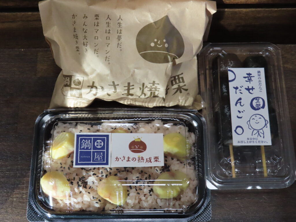 門前通りには笠間名物の栗菓子、焼き栗、団子など食べ歩きにぴったりのお店が並びます。たくさん歩いてお腹も空いていたので、団子と焼き栗、そしてお土産用に栗おこわも購入しました。