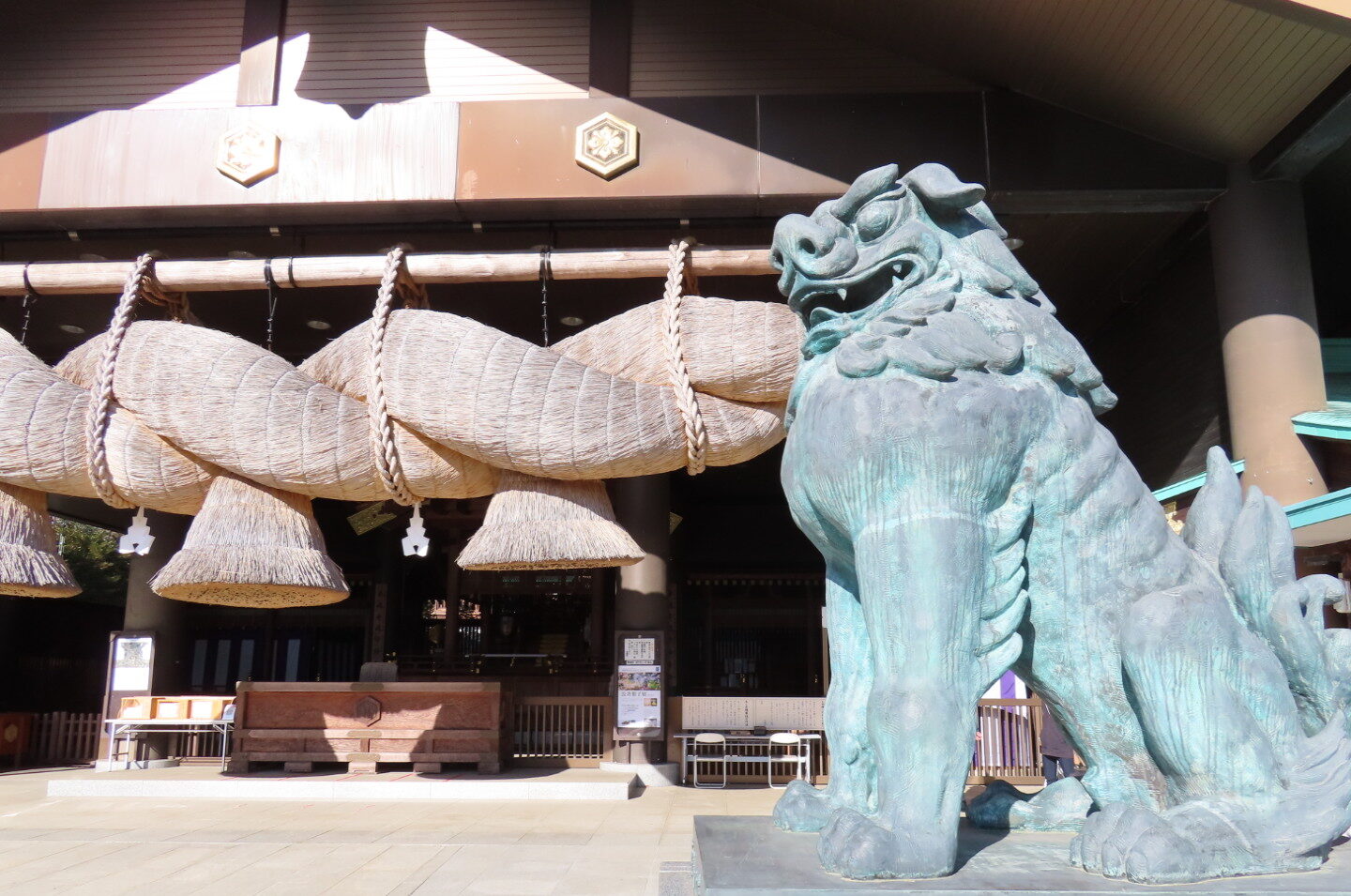 入り口から坂を上がり、階段を登ると「おおお〜!」と思わず声が出そうな景観が目に広がります。大社造りのご本殿、そして長さ16m・重さ6tの巨大注連縄がかかる拝殿。初めて目にするその迫力に息を呑みました。