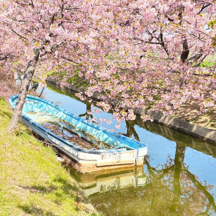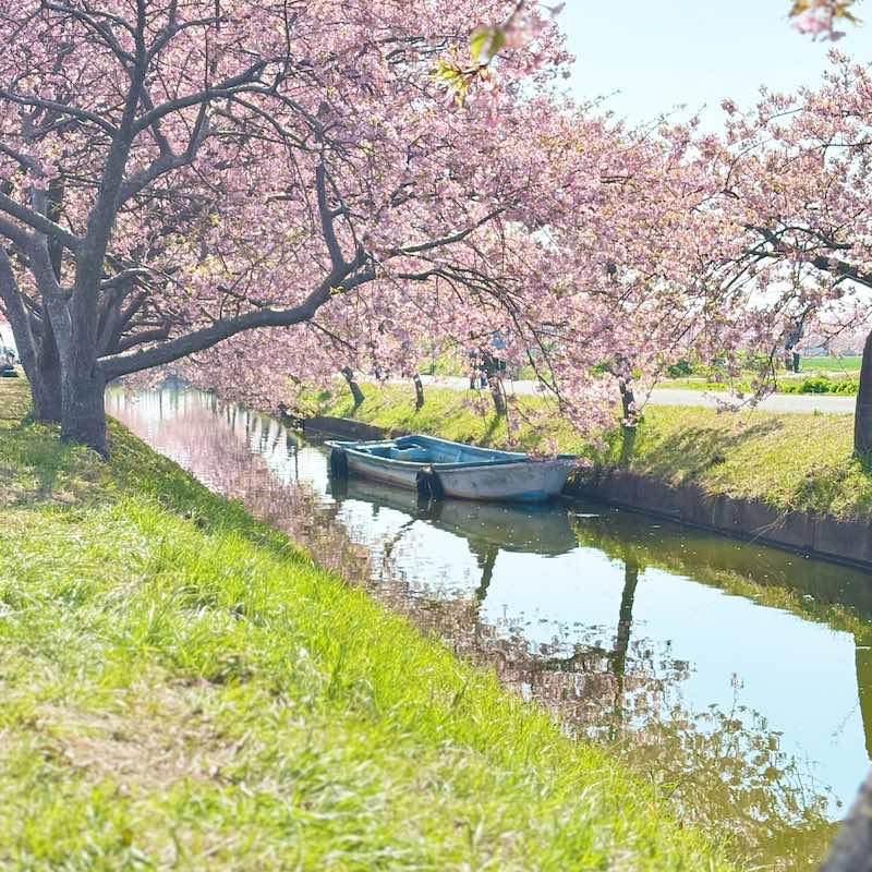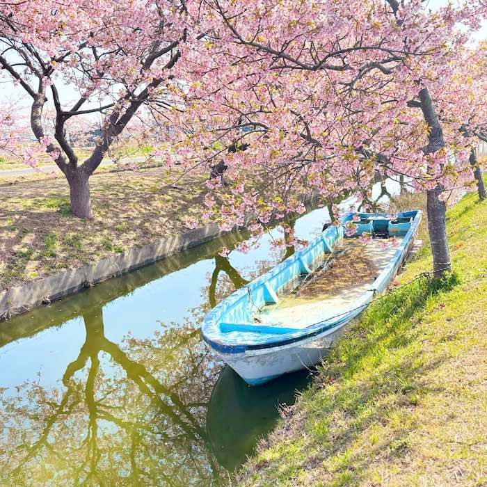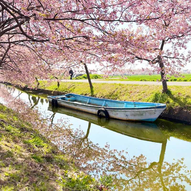 水路の両側に続く河津桜のトンネルと、水面、そしてその中に静かに佇むボート。ちょうどよい位置に収まるその光景は、まるでポスターのように完成された構図に感じられました。もしこのボートがなければ、ここまで印象に残る景色にはならなかったかもしれません。