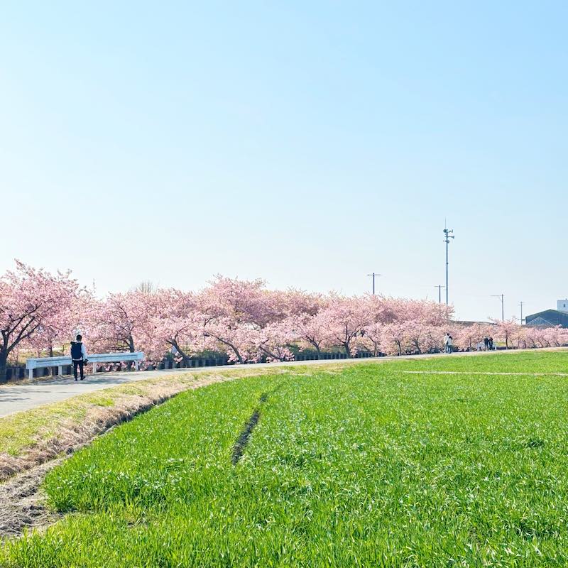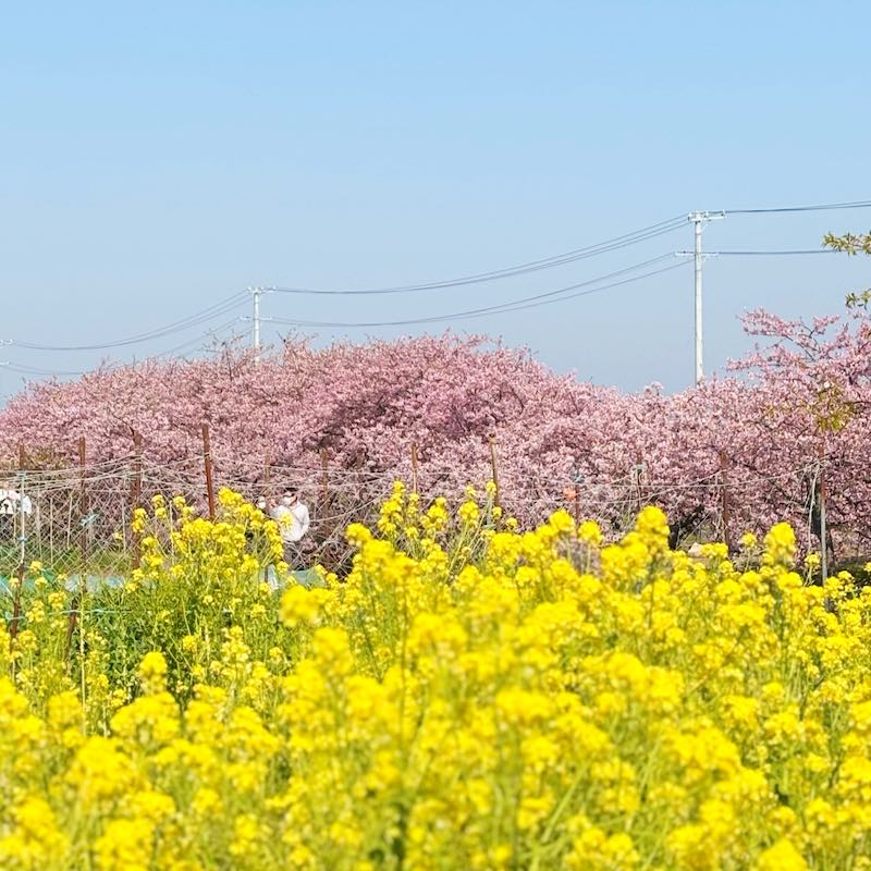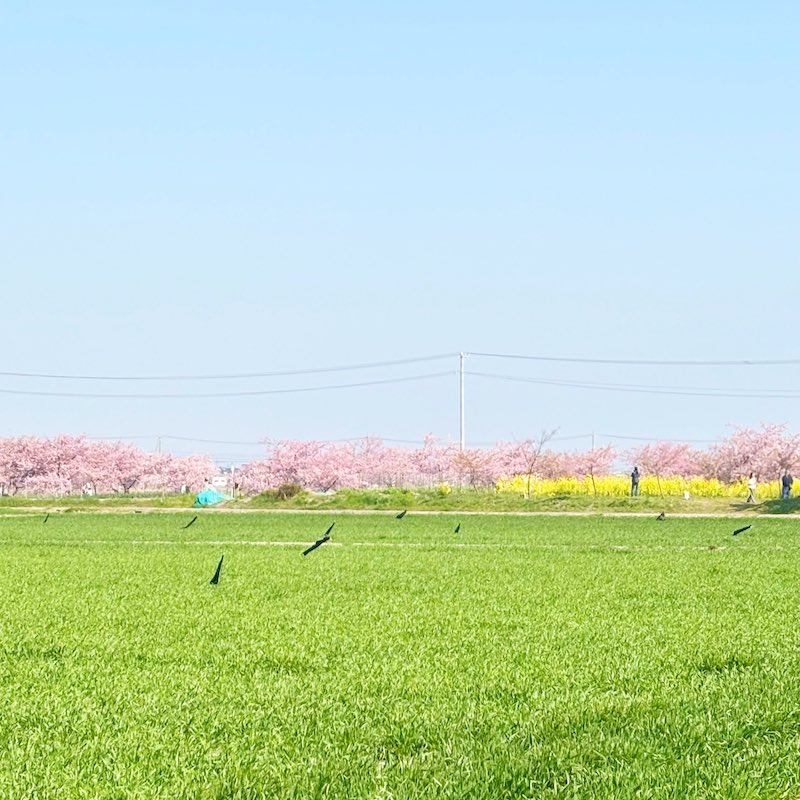 訪れたのは、ちょうど見頃を少し過ぎて葉が混じり始めた頃。それでも、農業用水路沿いに約1.5km続く河津桜並木は十分に美しく、菜の花の黄色も春らしい彩りを添えていました。
