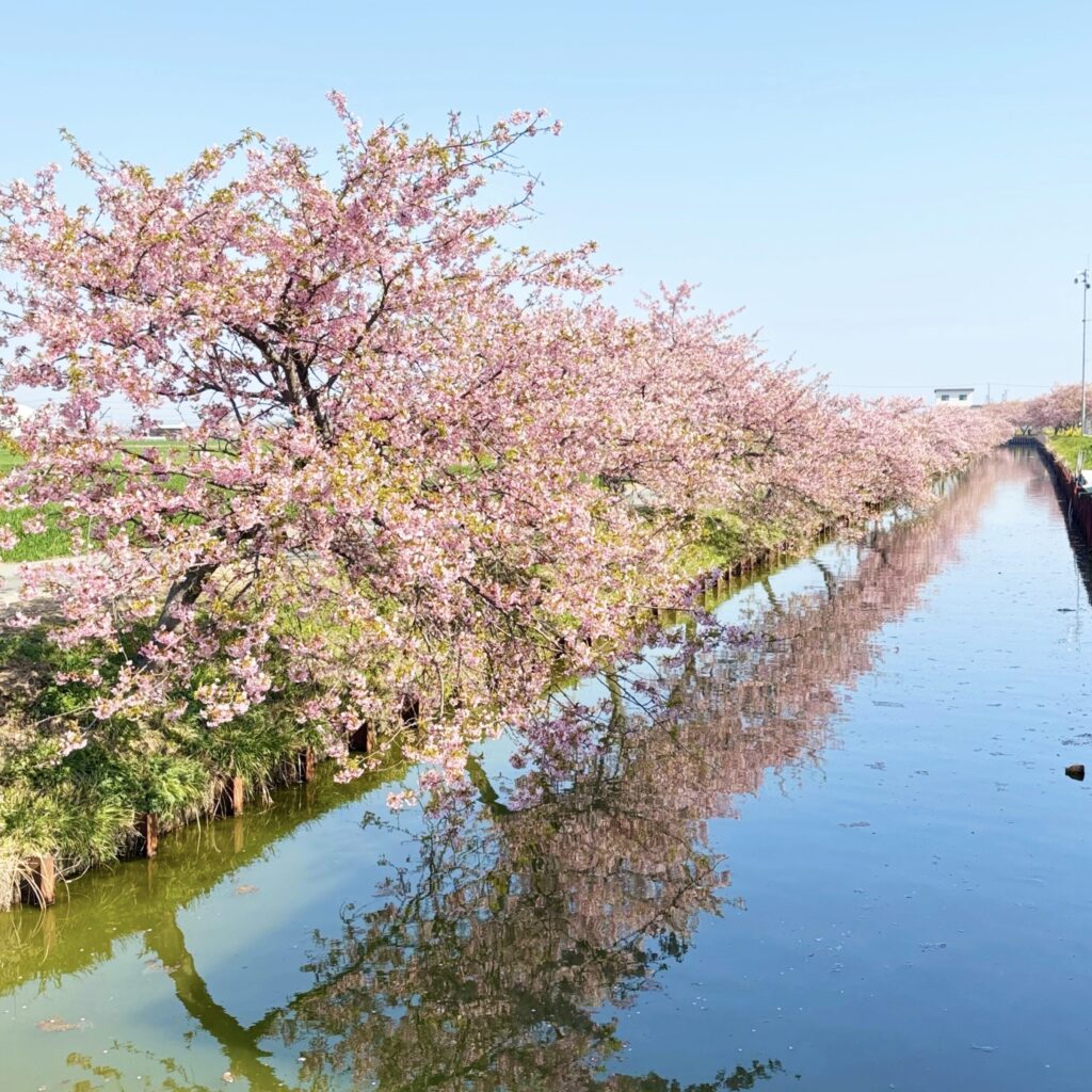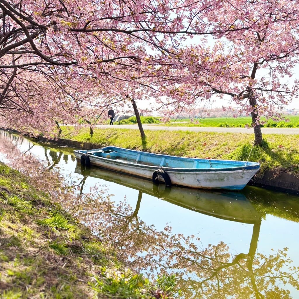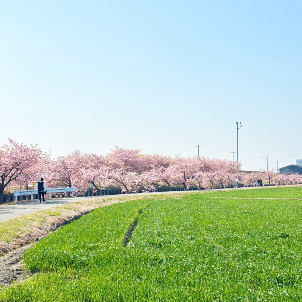 今年は開花が遅かったものの、訪れる頃には気温が一気に上がり、葉桜が混ざり始めたタイミング。それでも、農業用水路沿いに約1.5km続く河津桜並木は見応えがありました。