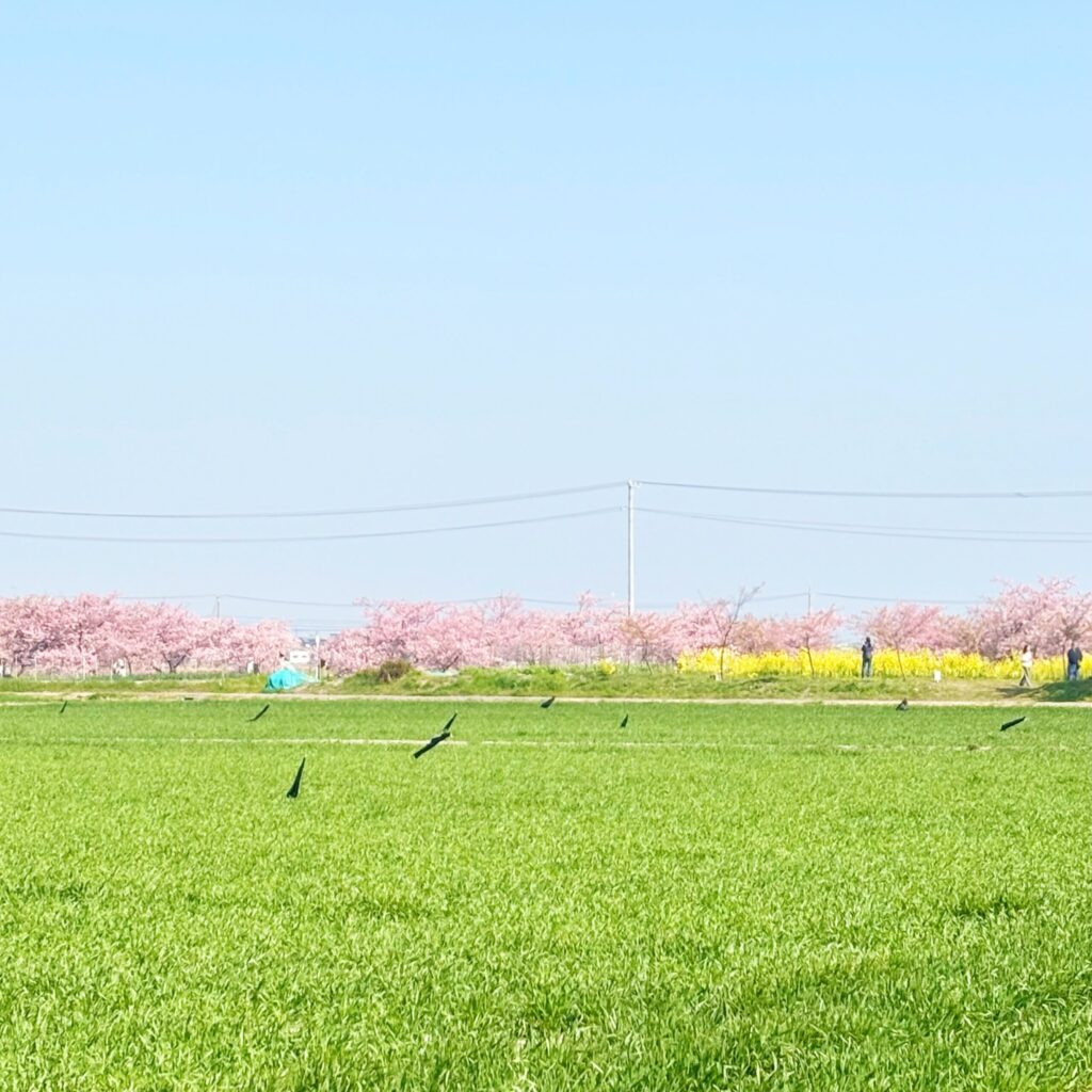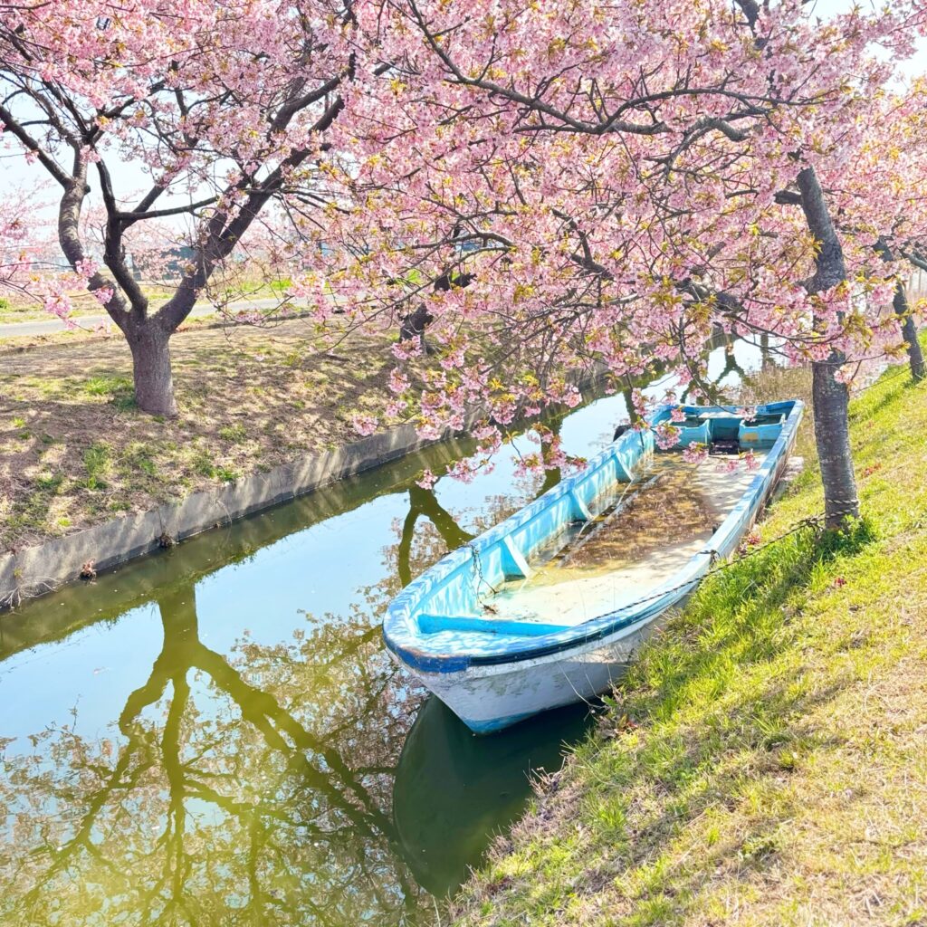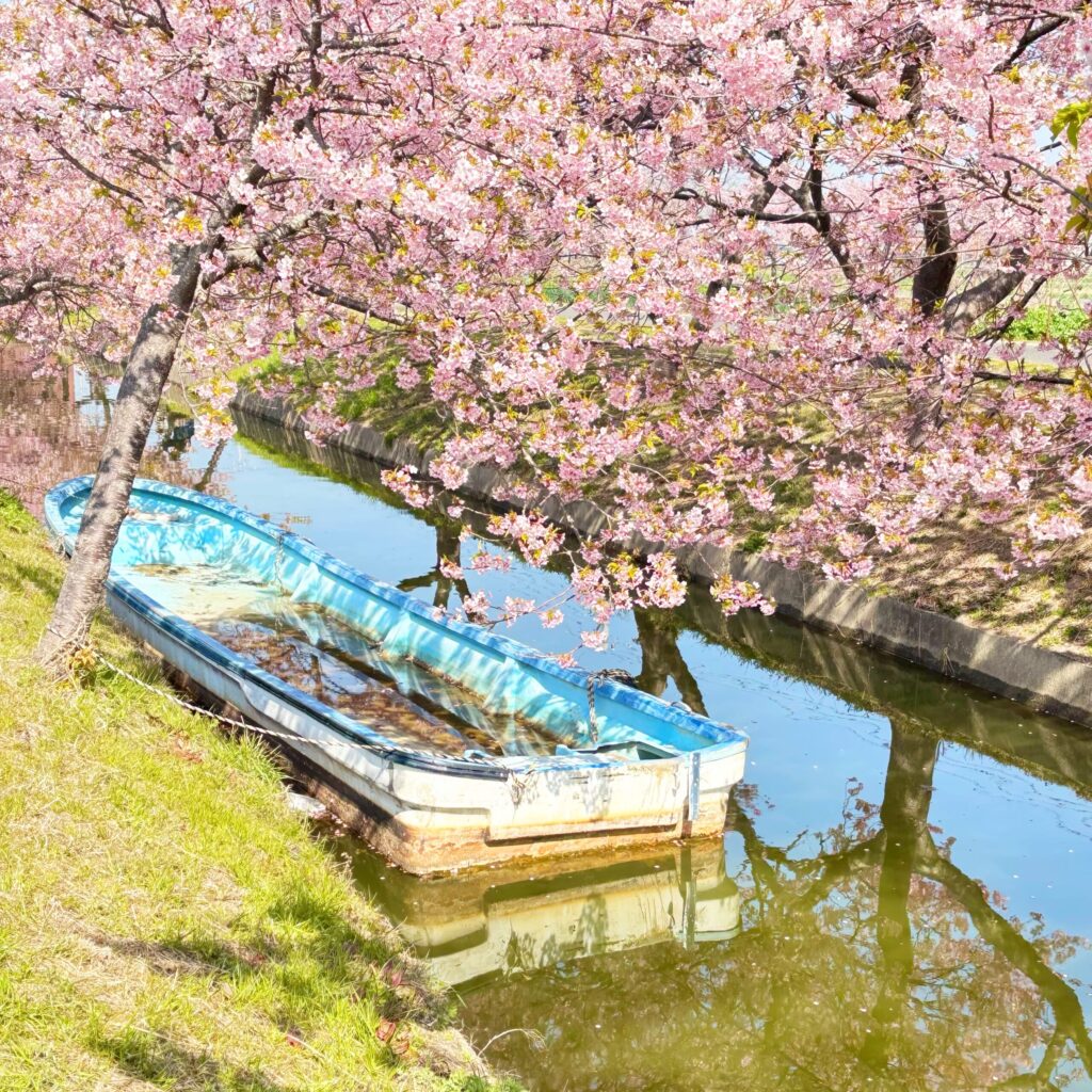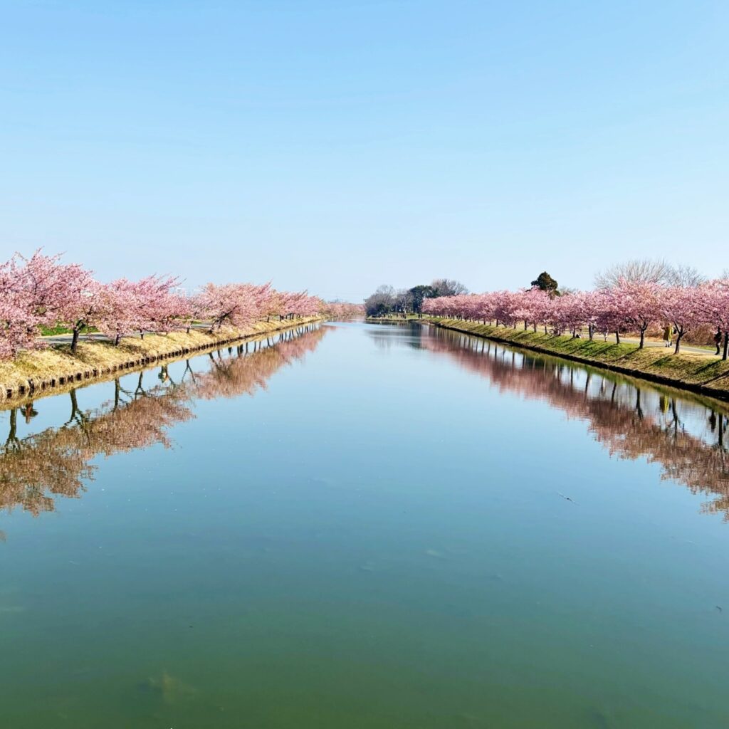 今年は開花が遅かったものの、訪れる頃には気温が一気に上がり、葉桜が混ざり始めたタイミング。それでも、農業用水路沿いに約1.5km続く河津桜並木は見応えがありました。
