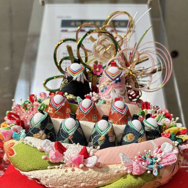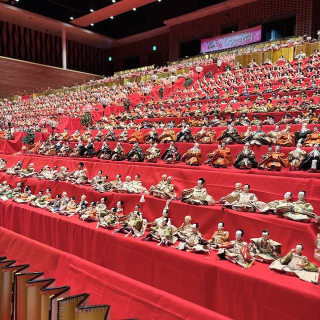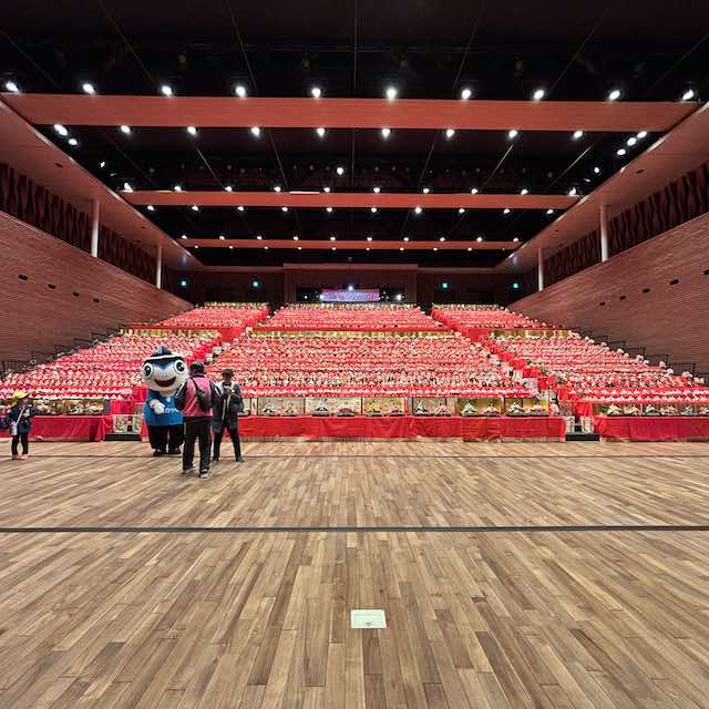 キュステには全国各地のお雛様が展示されており、特に目を引いたのは6年ぶりに復活した大規模展示。この巨大な展示は地元の学生さんが並べたそうで、手作りの温かさや地域の協力が伝わってきます。