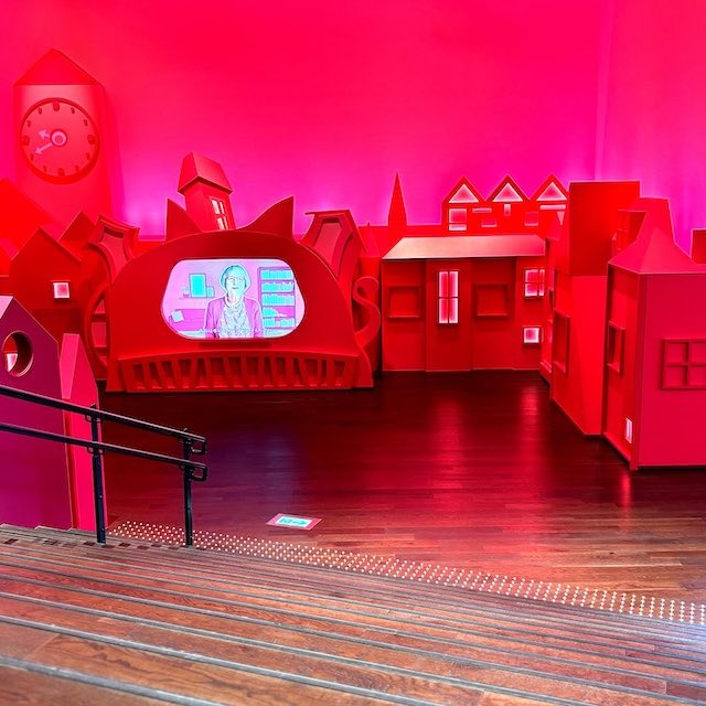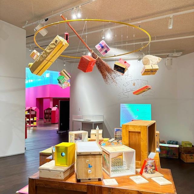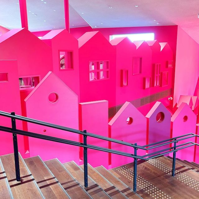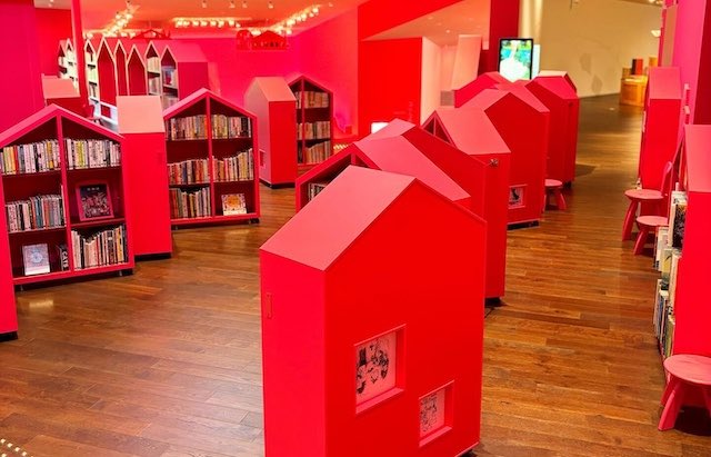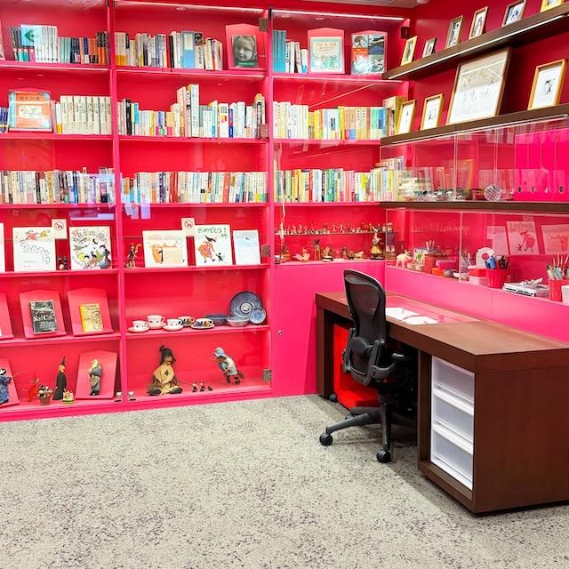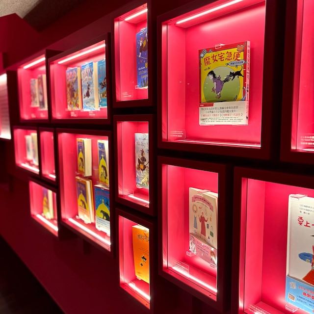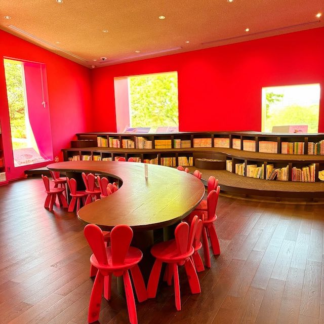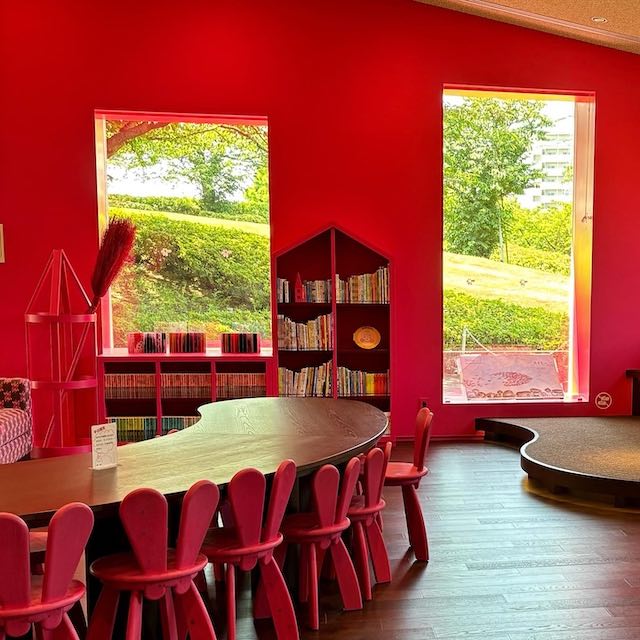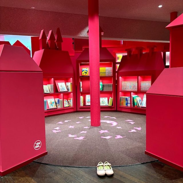 建物に一歩入ると、いちご色の温かい空間が広がり、コリコの町の雰囲気を感じられます。館内には約10,000冊の児童文学が揃い、作者のパネルや動画展示のほか、子ども向けの仕掛け・パズルやミニシアターもありました。親子連れや学校の課外授業の子どもたちの姿も多く、賑やかで楽しい雰囲気です。