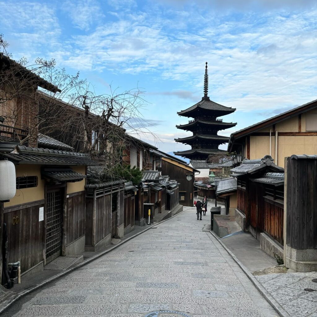 清水寺を後にして、二寧坂へ。石畳の坂道の先に、八坂の塔が見える景色はまさに「これぞ京都」。静かな時間に歩くと、日中とは違う風情を感じます。