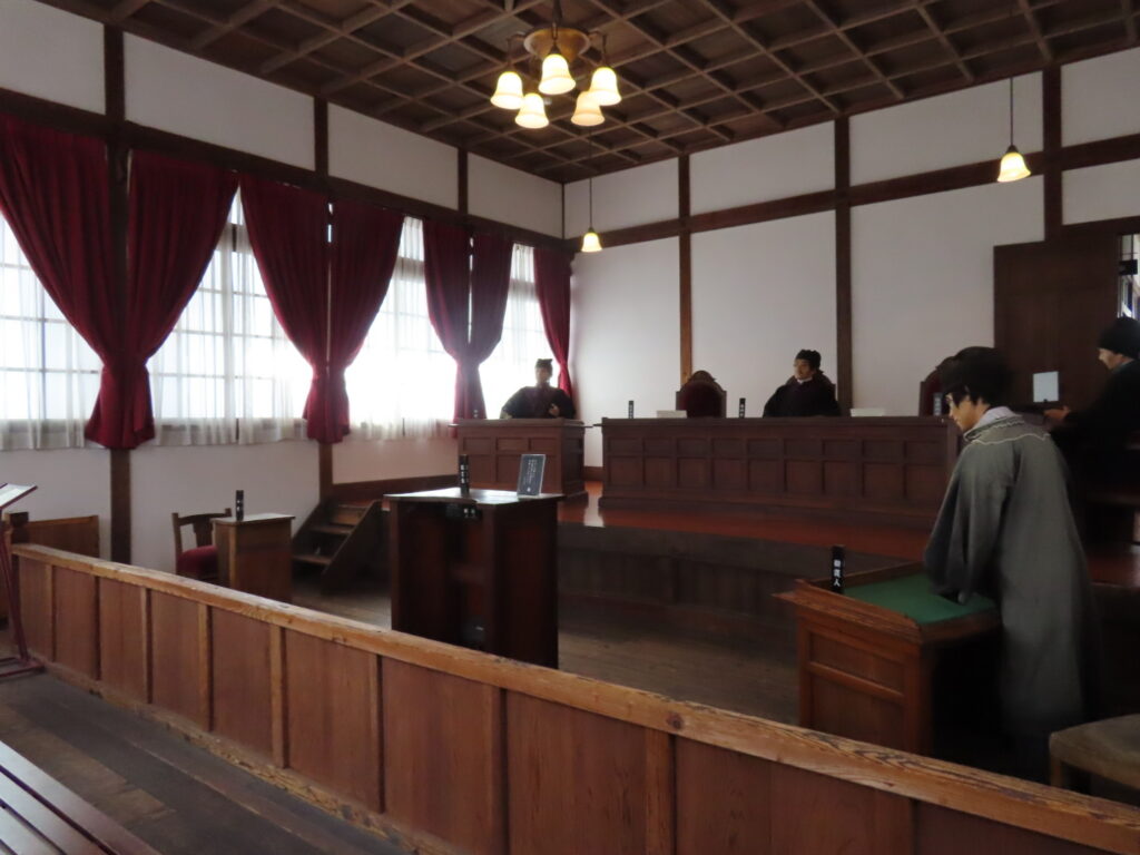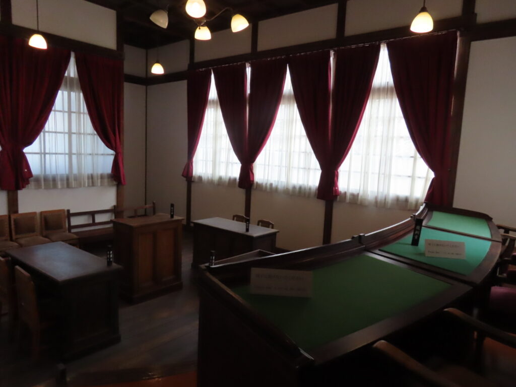 法廷内では裁判官・検事・被告人の立ち位置が再現され、音声ガイドで当時の裁判進行を体験できます。 法服の試着もでき、ひとりでも臨場感を味わえる展示でした。