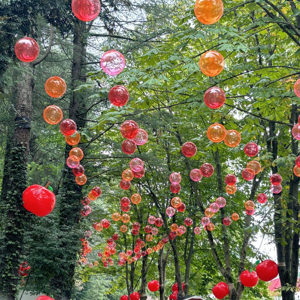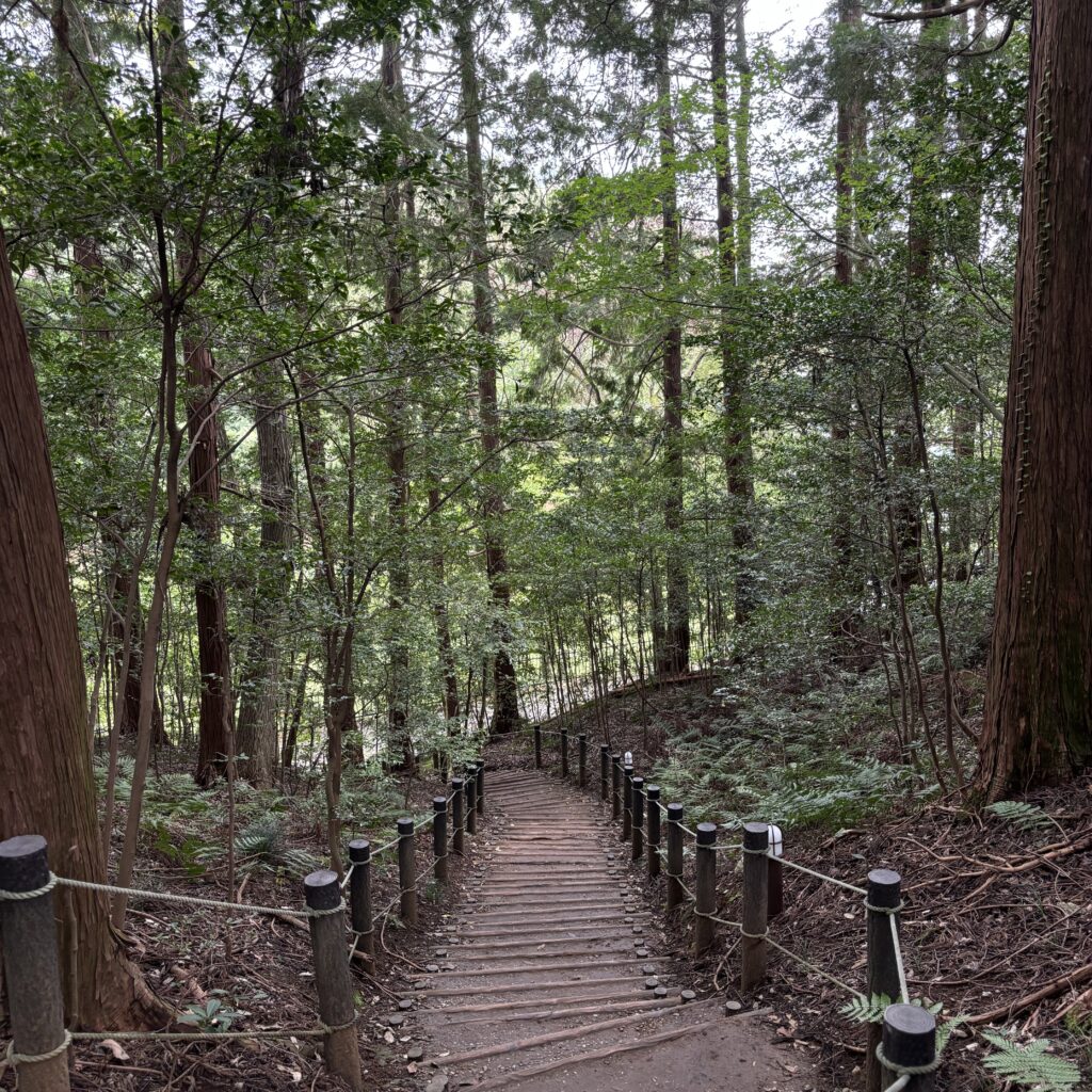 実際に訪れてみると、商業施設の色が思ったより鮮やかで、少し想像と違った部分もありました。それでも自然がいっぱいで、心地よい散策を楽しめました。小学生の遠足バスが何台も停まっていて、賑やかな一面も。