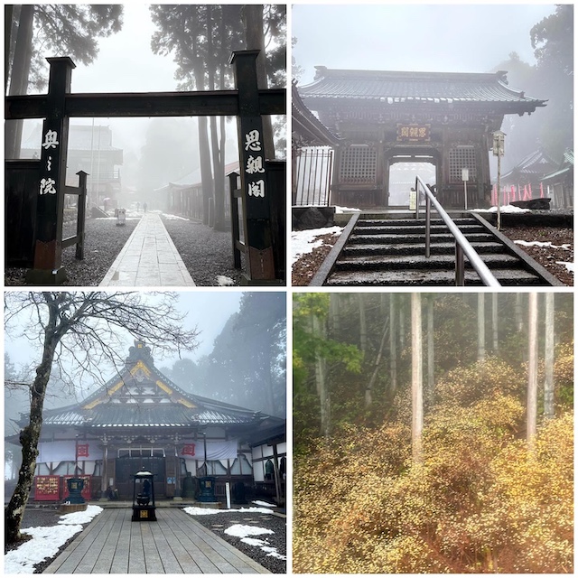 身延山ロープウェイで奥之院思親閣へ。晴れていれば七面山まで見えるという展望台もありましたが、この日は深い霧に包まれ視界は真っ白。展望台は断念し、参拝のみとなりましたが、霧の中で出会ったミツマタの群生がとても幻想的でした。