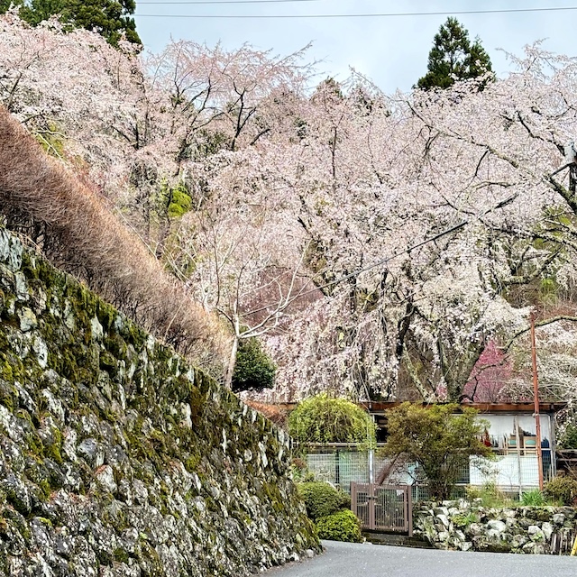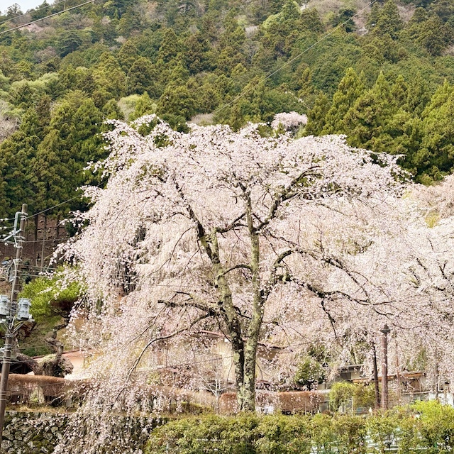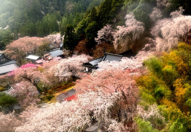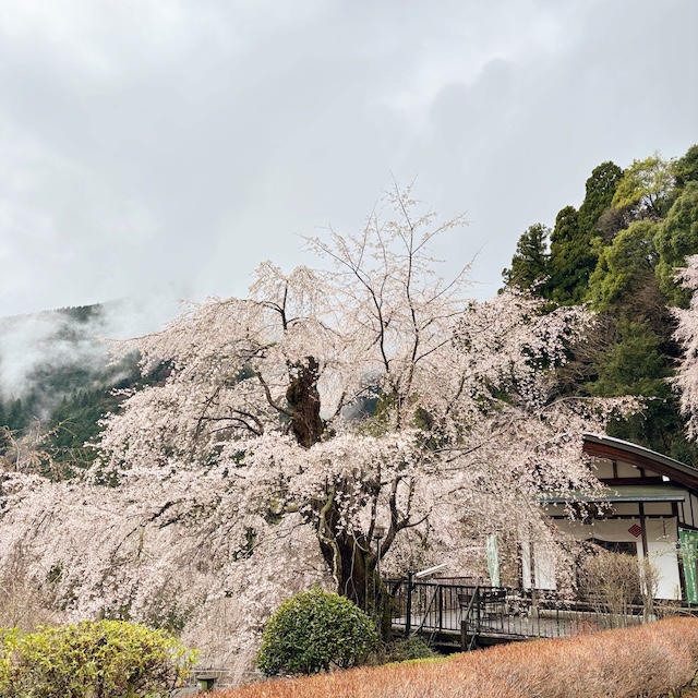 枝垂れ桜が里山一帯を包み込むように咲く景色は圧巻。