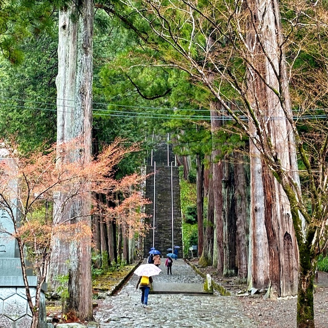 三門から続く、身延山名物の菩提梯(ぼだいてい)。その段数はなんと287段。名前に“梯”とつく通り、階段というよりほぼハシゴのような角度です。晴れていても15〜20分かかると言われている石段ですが、この日は雨で濡れていてとても滑りやすく、傘を持ちながら慎重に登りました。それでも息が上がるほどの急階段。雨の中、この石段を下りていくご高齢の方々の姿には本当に頭が下がりました。