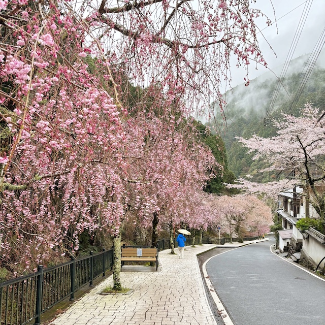 この日は寒の戻りで冷たい雨。さらに桜のピークが過ぎてしまい、境内でよく見かける有名な枝垂れ桜は散り始め…。それでも、まだまだ多くの桜が見頃を保っていて、雨に濡れた枝垂れ桜は艶やかでしっとりとした美しさがありました。
