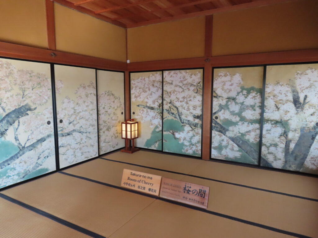 まずは好文亭へ。偕楽園とは別に入館料がかかります。徳川斉昭が自ら設計した木造2層3階建てで、空襲で焼失後、昭和44年に再建されました。画伯によって描かれた襖絵はもちろん、建物の美しさ、3階からの見晴らしは圧巻で、彼女と顔を見合わせながら「素敵だね」と声をそろえてしまうほど。