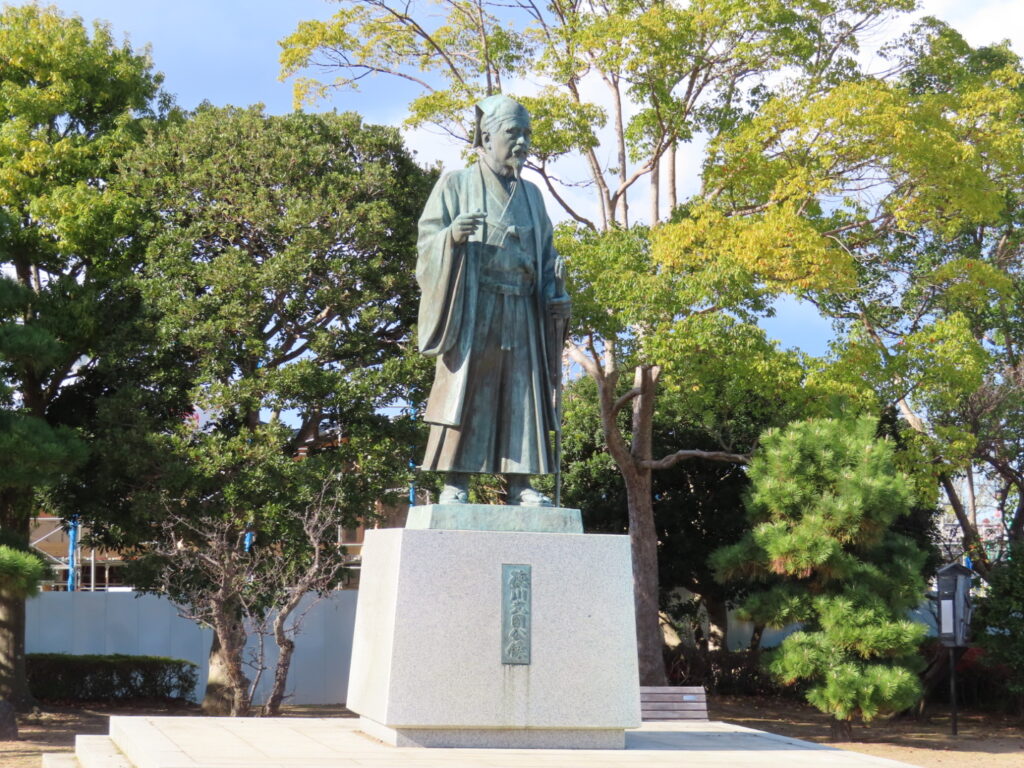 座っている二宮金次郎が境内に