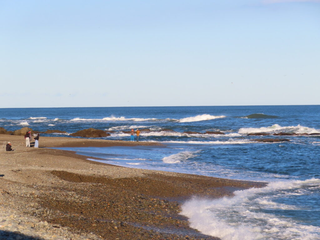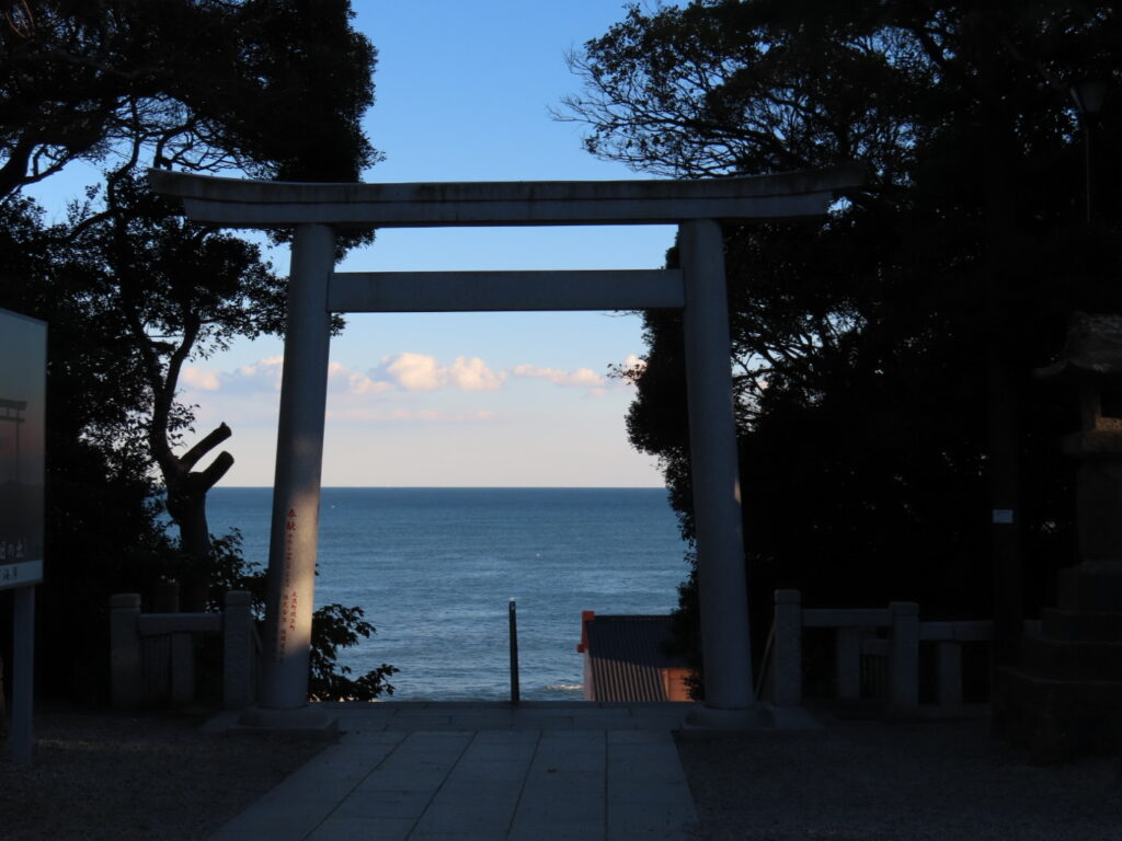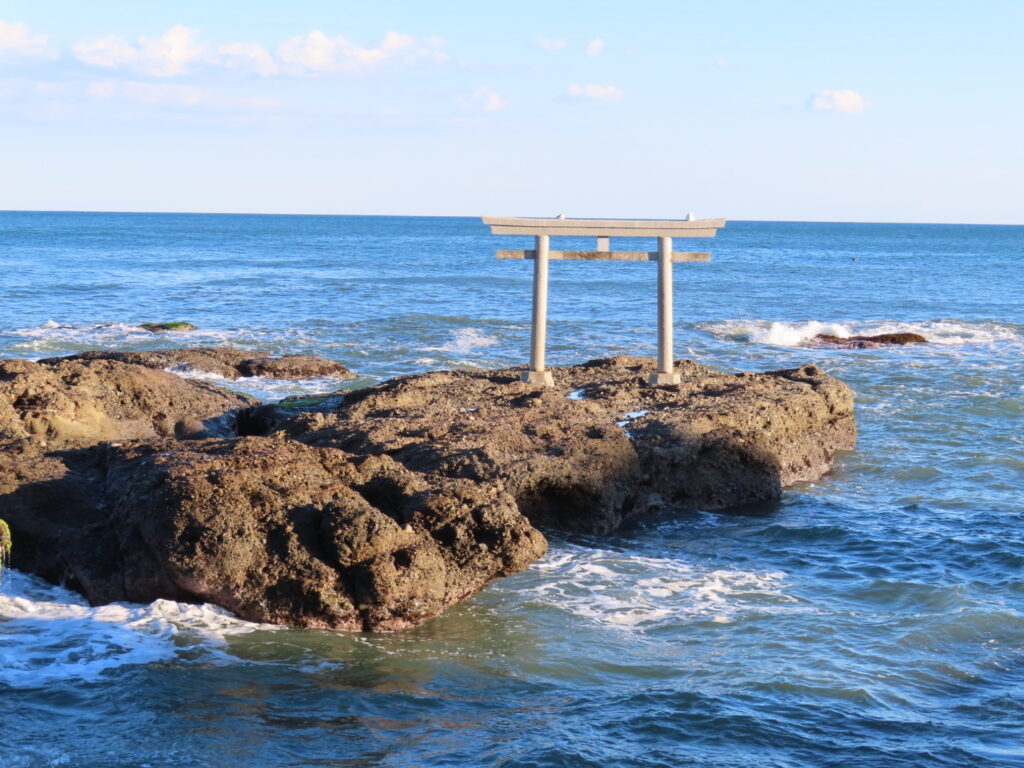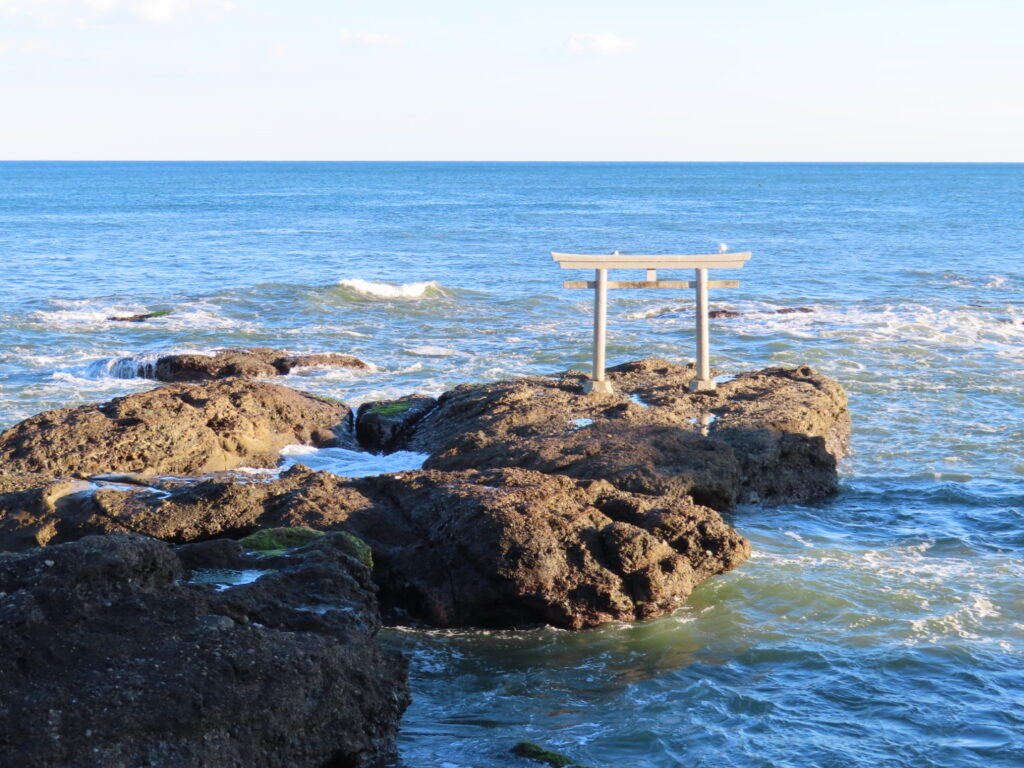 バスを降りると、白い大きな鳥居と長い階段がそびえ立ち、思わず圧倒されました。階段を上がる前に、道路の向かい側を見ると、海の岩の上に赤い鳥居が立ち、波が寄せるたび水しぶきが鳥居を包み込むように揺れています。