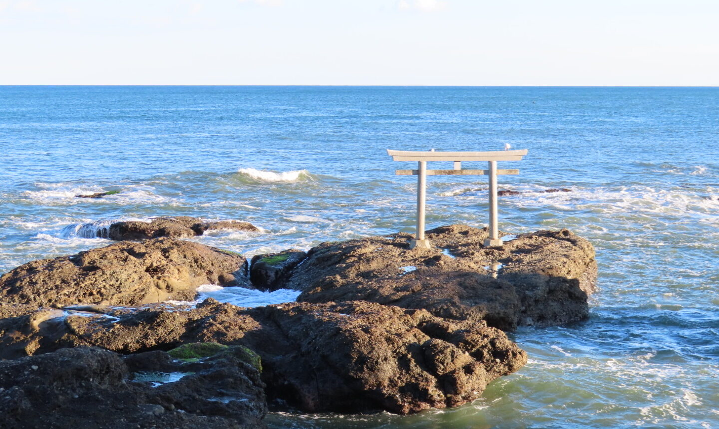 バスを降りると、白い大きな鳥居と長い階段がそびえ立ち、思わず圧倒されました。階段を上がる前に、道路の向かい側を見ると、海の岩の上に赤い鳥居が立ち、波が寄せるたび水しぶきが鳥居を包み込むように揺れています。